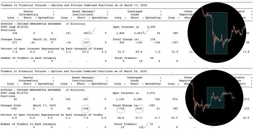 Начнем с COT-отчета за период с 10 по 17 марта. За это время рынок вынес огромное количество лонг-трейдеров. Однако падение приостановилось на уровне $4700. На этом падении заметно прибавилось коротких позиций у Asset Managers (+103). У Leveraged Funds также сохранился перевес в пользу шорт-позиций, которые удерживали 18 трейдеров. За период с 17 по 24 марта наблюдалось крупное закрытие как длинных (-733), так и коротких позиций (-616) у Leveraged Funds. Asset Managers закрыли 168 шорт-позиций, но при этом никаких значительных изменений по лонг-позициям у них не зафиксировали. Это говорит нам о том, что игроки временно покидают рынок. Открытый интерес значительно упал. Из 18 трейдеров в Leveraged Funds осталось только 13. Согласно данным Чикагской товарной биржи (CME), объем торгов 27 марта составил всего 3029 контрактов. Для сравнения - еще 23 марта показатель составил 9757. Сейчас идет закрытие мартовских контрактов, открытый интерес уходит в апрельский. Активность существенно сократилась, и похоже, что рынок сейчас не на разворотной стадии после сильного падения. Было уже три слабых попытки пробить уровень $6800, но все они провалились. Необходимо следить за этим уровнем - его пробитие откроет дорогу выше. Покупатель сейчас явно в слабой позиции, и рынку не хватает топлива. Asset Managers и Leveraged Funds не набирают лонг-позиции на фоне краткосрочно растущего рынка, а только фиксируют прибыль по шортам (скорей всего цена так и будет прыгать с отметки $5500 до $6800 пока не найдется сильный покупатель или продавец).
