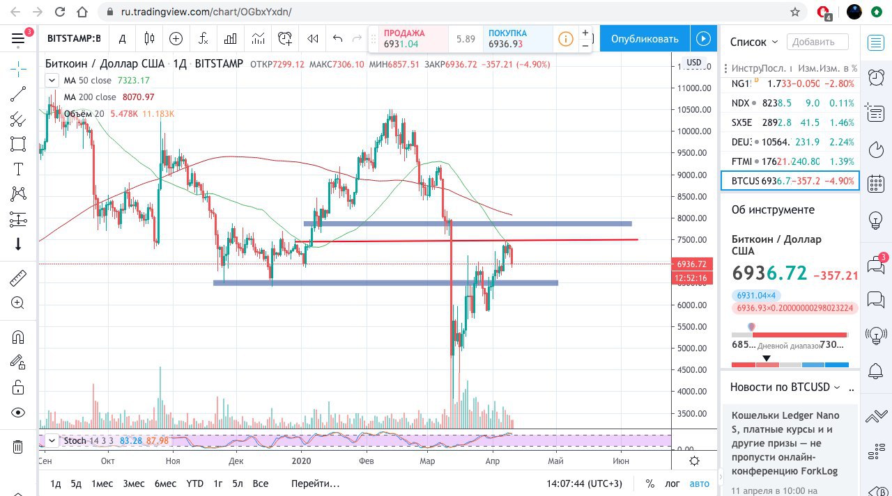 После двух безуспешных попыток закрепиться выше $7400, биткоин несколько дней находился в диапазоне $7400-$7200. Сегодня утром цена из этого диапазона вышла, упав ниже $7000. Что на традиционных рынках? ОПЕК+ пришли к соглашению о сокращении добычи, хотя ценам на нефть это не помогло. Вчера ФРС пообещала пакет помощи на $2,3 трлн для малого и среднего бизнеса и местных администраций. Индекс S&P 500 всю неделю рос, и вчера этому даже не помешало падение цен на нефть. Очевидно, что доллар ожидает инфляция и снижение покупательской способности. Что при этом ожидает реальную экономику, не знает даже Трамп, рейтинг которого падает. Активы, которые защищены от инфляции, ожидает рост. Если же актив обеспечивает приватность и возможность свободно распоряжаться своими средствами, если им владеет меньше 10% населения, то в среднесрочной перспективе его рост неизбежен. Пролив ниже $7000 это временное явление, цена найдет поддержку на $6800-$6700 и вернется выше $7000 в ближайшее время. Альтернативный сценарий - если будет сильный негатив на традиционных рынках или паника, связанная с коллективными исками против 11 криптовалютных проектов, то биткоин может упасть к $6400-$6500. Возвращение биткоина выше $7000 приведет к повторной попытке закрепиться выше $7400. Что говорят графики? Текущее снижение сопровождается невысокими объемами, а значит серьезных фиксаций прибыли крупными игроками еще не было. Ключевой диапазон, который необходимо удержать покупателям на дневном таймфрейме - зона $6462-6800$. В ближайшее время биткоин с высокой долей вероятности будет тестировать данный диапазон. После реакции покупателей в этой зоне можно будет говорить о дальнейшем движении BTC.
