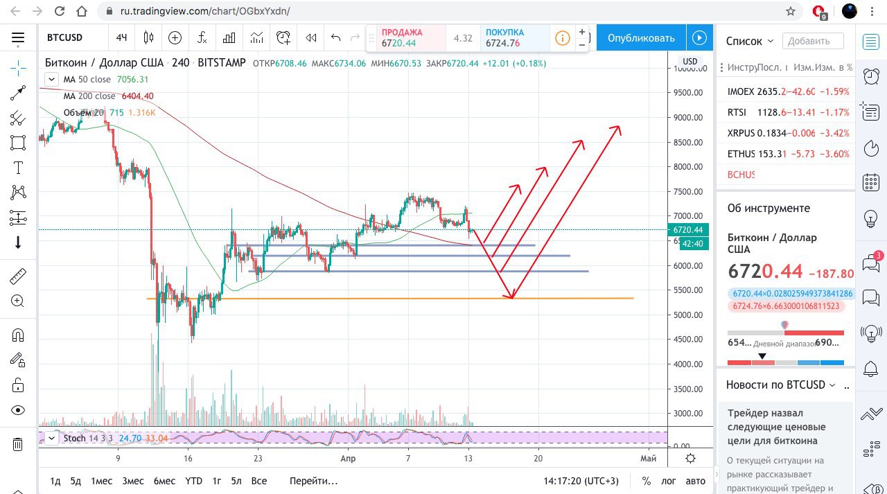 На недельном графике прослеживается четкая картина, которая сигнализирует о сохранении нисходящего уклона. Поэтому в прошлой публикации я и ставил ордера на покупку BTC на указанных ранее уровнях. Сейчас на графике сформировано подряд четыре недельные свечи с длинными верхними фитилями, что говорит о наличии сильного сопротивления. Также биткоину предстоит подтвердить пробой $6900 на закрытии. На последней недельной свече цена превысила уровень $6900, но до конца недели еще 2 дня, за которые многое может измениться. Принимая во внимание дневные уровни, можно предположить, что биткоин доберется до сопротивления $7500, после чего снова вернется под отметку $6900. Но в случае если через 2 дня недельное закрытие произойдет над $6900 это аннулирует сценарий и послужит предпосылкой для продолжения роста.