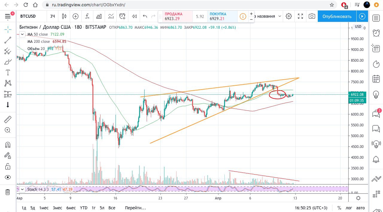 Сегодня утром, 16 апреля, курс биткоина вновь преодолел отметку $7000, перед этим опустившись на $6456 и собрав стопы лонгистов. В прошлом анализе рынка я предупреждал об этом падении (к $6462) и возможном последующем отскоке. Поэтому советовал: если заходить в лонг, то делать это только частями, понемногу на каждом из уровней поддержки, а не ждать самой низкой отметки. И вот на первом же уровне сработал ордер на покупку после чего последовал сильнейший отскок и как итог +10% прибыли за пару часов. Что ждать дальше? Лично я ордера на оставшихся уровнях не убираю, а прибыль с этой сделки фиксирую, так как шанс столь же быстро опустится обратно еще присутствует. Отменой варианта падения будет закрепление котировок выше $7000 (что BTC пытается сделать уже в шестой раз за месяц), это укажет на возможный рост к отметкам $7800-8000. Но об этому будет отдельный пост.