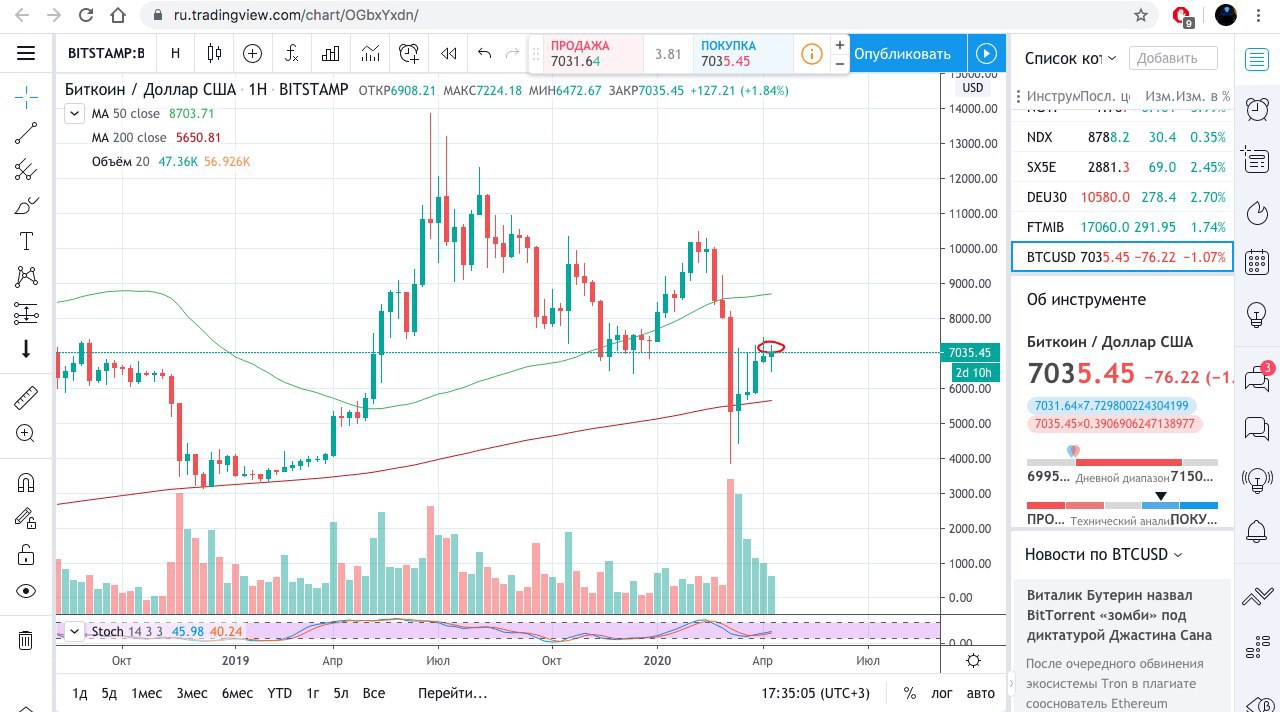 Биткоин установил новый более высокий локальный максимум этим утром около $8000. За 13 дней до халвинга участники рынка надеются, что первая криптовалюта сможет подняться выше уровней 100- и 200-дневных скользящих средних и хотя бы протестировать сопротивление $8500. «Абсурдно плотное сосредоточение скользящих средних впереди: 100 DMA, 200 DMA, 20 WMA, годовое VWAP, 61,8% смещения, годовая ось. Тем не менее, биткоин, по всей видимости, настаивает на продолжении. Сквиз паттерна приведёт к растяжению/волатильности. Я поддерживаю ожидания дальнейшего роста», – пишет аналитик filbfilb. Тон Вейс называет скопление уровней сопротивления «чудовищем», которое, вероятно, постарается удержать биткоин от подъёма к $9000, но не исключает возможность прорыва до этого уровня. После прохода $9 000, по его словам, в силу вступит сценарий, описанный аналитиком PlanB, который прогнозирует рост выше $100 000 к 2024 году. Кстати, сегодня ночью в нашем чате я предупреждал о простреле биткоина к $8200.