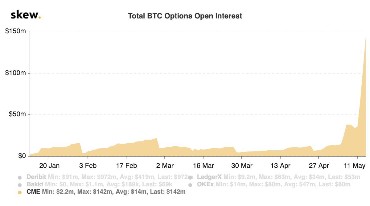 Объем открытого интереса в опционах на биткоин на Чикагской товарной бирже (CME) к 15 мая достиг уровня в $142 млн, что превысило значение двухнедельной давности более чем в десять раз. По данным поставщика данных о криптовалютных рынках Skew, в конце апреля значение этого показателя почти достигло $12 млн. За несколько дней до третьего халвинга объемы торгов биткоин-опционами подскочили до $10 млн, прежде чем вернуться к привычным для апреля $1 млн за день до сокращения вдвое награды майнерам. После этого события участники CME стали еще активнее торговать опционами – 11 мая объем торгов подскочил до $11 млн, а в последние три дня варьировался в диапазоне $30-40 млн. За неделю до халвинга аналогичная ситуация на CME наблюдалась и по количеству открытых позиций на биткоин-фьючерсы. Напомню, легендарный трейдер и основатель хедж-фонда Tudor Investment Пол Тюдор Джонс сообщил своим клиентам, что рассматривает торговлю биткоин-фьючерсами как страховку против текущей политики центральных банков, которые печатают деньги для борьбы с пандемией коронавируса.