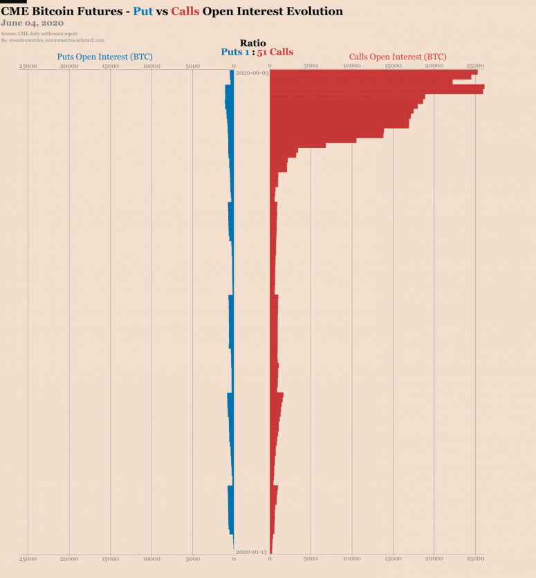 Текущий месяц оказался ознаменован ростом объёмов активных позиций по биткоин-фьючерсам Чикагской товарной биржи до новых исторических максимумов выше $400 млн. В эту пятницу истекают контракты по биткоин-фьючерам на 23 000 BTC ($205 млн), по биткоин-опционам – 10 000 BTC ($89 млн). Это соответствует приблизительно половине открытого интереса по каждому из продуктов, отмечает аналитический портал Skew. В целом, май не был примечательным в ценовом отношении, несмотря на халвинг и перемещения старых монет. Весь месяц биткоин торговался в узком диапазоне. Поэтому рекордные объёмы подлежащих закрытию или переносу позиций заставляют участников рынка ожидать повышения волатильности курса уже в ближайшие дни. Как видно на графике выше, во многих случаях истечение фьючерсов было отмечено падением цены биткоина. Однако, на графике CME, остаётся гэп между уровнями $9 130 и $9 065, закрытие которого может произойти перед реализацией возможного медвежьего сценария, как неоднократно бывало в прошлом.