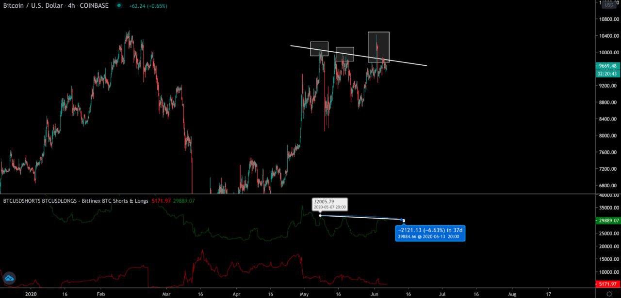 За период c 19 мая по 2 июня, охватывающий два последних COT-отчета, биткоин продемонстрировал падение на 630 пунктов (-6.38%). Цене так и не удалось закрепиться над отметкой в $10 000. За период с 19 по 26 мая значительно сократилось количество шорт-контрактов в разделе Asset Managers (-100). Сохранялся значительный перевес длинных позиций (363). Это говорит о том, что институционалы ожидали пробития уровня $10 000. В разделе Leveraged Funds спекулянты закрыли 1589 длинных и 2059 коротких контрактов. Это свидетельствует о неопределенности и что, скорее всего, часть трейдеров предпочла выйти из рынка, чтобы перезайти после того, как биткоин либо пробьет $10 000, либо же начнет падение до $8000 (именно так поступил и я). За период с 26 мая по 2 июня, когда цена не удержала позиции на рубеже $10 000, ситуация изменилась! В разделе Asset Managers прибавилось значительное количество новых шорт-контрактов. Это реакция на очередное падение биткоина. Длинных позиций также прибавилось, хотя и в два раза меньше по сравнению с короткими. В разделе Leveraged Funds прибавилось 981 шорт-контрактов, тогда как закрылось 199 лонг-контрактов. Это реакция на слабость биткоина. Очевидна и реакция трейдеров на бирже Bitfinex. Лонги сокращаются с каждым провалом биткоина пробить отметку в $10 000. Рынок устал ждать. Шорты, судя по объемам на Bitfinex, не накапливаются. Неопределенность сильно влияет на игроков, и многие предпочитают сейчас оставаться «на заборе». Все внимание - на уровни $10 000 и $8600 Цена может в любой момент попытаться пробить $10 000, а может и выйти из восходящего канала, пробив $8600, что может открыть дорогу до $7500-$8000. Всё же этот отчет больше указывает на падение, чем на рост.