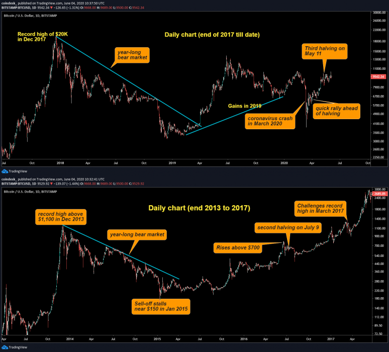 Аналитик Bloomberg Майк Макглоун, как мы сообщали ранее, считает, что золото и биткоин являются «главными кандидатами на рост» в этом году. Аналитик ожидает, что биткоин сможет подняться к историческому максимуму в этом году на фоне «всё более благоприятных» фундаментальных и технических факторов. «Что-то должно пойти действительно не так, чтобы биткоин не стал расти», – пишет он, указывая на возможную цель в $28 000. В основе этого прогноза лежит тот факт, что поведение рынка в течение последних двух с половиной лет во многом напоминает динамику на аналогичном отрезке после максимумов декабря 2013 года. Биткоин поднялся до исторического максимума около $1 100 в начале декабря 2013 года, а в следующем году снизился больше чем на 55%. Медвежий рынок достиг минимумов около $150 в январе 2015 года, к четвёртому кварталу консолидация сменилась ростом. Ко времени второго халвинга 9 июля 2016 года ценя поднялась выше $700. Достигнув максимума около $20 000 в середине декабря 2017 года, биткоин упал на 75% в 2018 году. Минимум был обнаружен на уровне $3 100 в декабре того же года, а в следующем году произошёл рост на 90%. В преддверии третьего халвинга 11 мая биткоин преимущественно рос, исключая обвал в марте, и в начале прошлого месяца достиг $10 000. Это согласуется с паттерном предыдущего этапа. Макглоун также заявляет, что пандемия коронавируса и проводимое центральными банками количественное смягчение ведут к укреплению рынка биткоина и снижению его волатильности. Для иллюстрации стремления институционалов покупать и держать криптовалюту аналитик обращается к примерам биткоин-траста компании Grayscale и фьючерсного рынка Чикагской товарной биржи (CME).