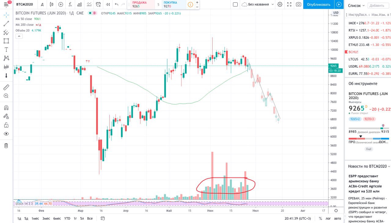 Биткоин-фьючерсы на CME истекают в эту пятницу, 26 июня. Анализ динамики криптовалюты в предыдущие даты экспирации указывают на медвежий уклон, но пока результаты не выглядят достаточно убедительно для составления 100% прогноза, хотя тенденция очень похожа! В этом году истечение контрактов происходило 31 января, 28 февраля, 27 марта, 24 апреля и 29 мая. Любопытно, что в четырех из этих пяти случаев курс BTC формировал медвежьи свечи на дневных графиках. Что касается текущей динамики, биткоин сильно подешевел накануне на повышенных торговых оборотах, утратив 50-дневную среднюю скользящую. Более того, котировки продолжают падение на торгах в четверг, лишившись важной поддержки в районе $9250, которая ранее неоднократно выступала в качестве плацдарма для отскока. Все это говорит в пользу дальнейшего медвежьего хода. Сегодня котировки уже успели нарушить целостность уровня $9000 и на момент написания публикации расположились немногим выше этой зоны. Продолжение продаж приведет монету к важному уровню $8500.