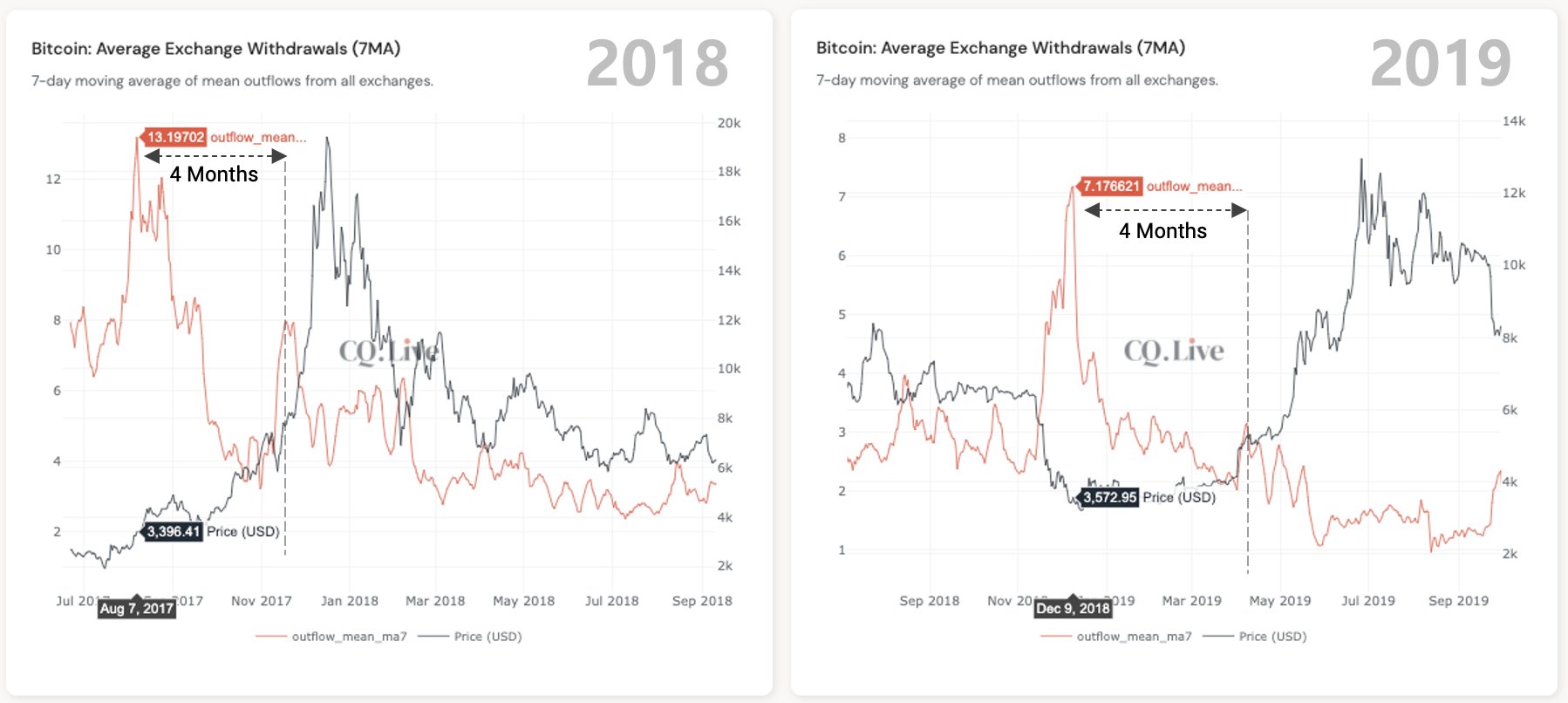 Как отмечает аналитик Коул Гарнер, вчера был зафиксирован крупнейший отток биткоинов с кошельков пулов с того времени, когда цена в последний раз поднималась к $10 000 более месяца назад. В предыдущий раз такой отток предшествовал кратковременному падению курса криптовалюты ниже $9 000. «Ожидаю крупных продаж очень скоро», – написал Гарнер, позднее добавив: «Возможно, это внебиржевая сделка, поскольку не похоже, что потоки пошли на биржи. В любом случае, перемещение крупных объёмов монет майнерами никогда не было положительным признаком». В то же время, CEO криптоаналитической платформы CryptoQuant Ки Янг Джу отмечает, что «киты» или крупные держатели на предыдущем отрезке выводили монеты с бирж, и видит в этом бычий признак. «Бычий рынок обычно начинается спустя 4 месяца после того, как средняя величина вывода активов с бирж достигает годового максимума. Когда киты активны, обычно это означает стадию аккумуляции. Судя по последним данным, бычий рынок должен настать в середине июля», – заявляет он. Из этих данных можно сделать вывод, что в этом месяце, возможно, произойдет ожидаемое падение курса BTС, а отрастать он начнет только в середине следующего.