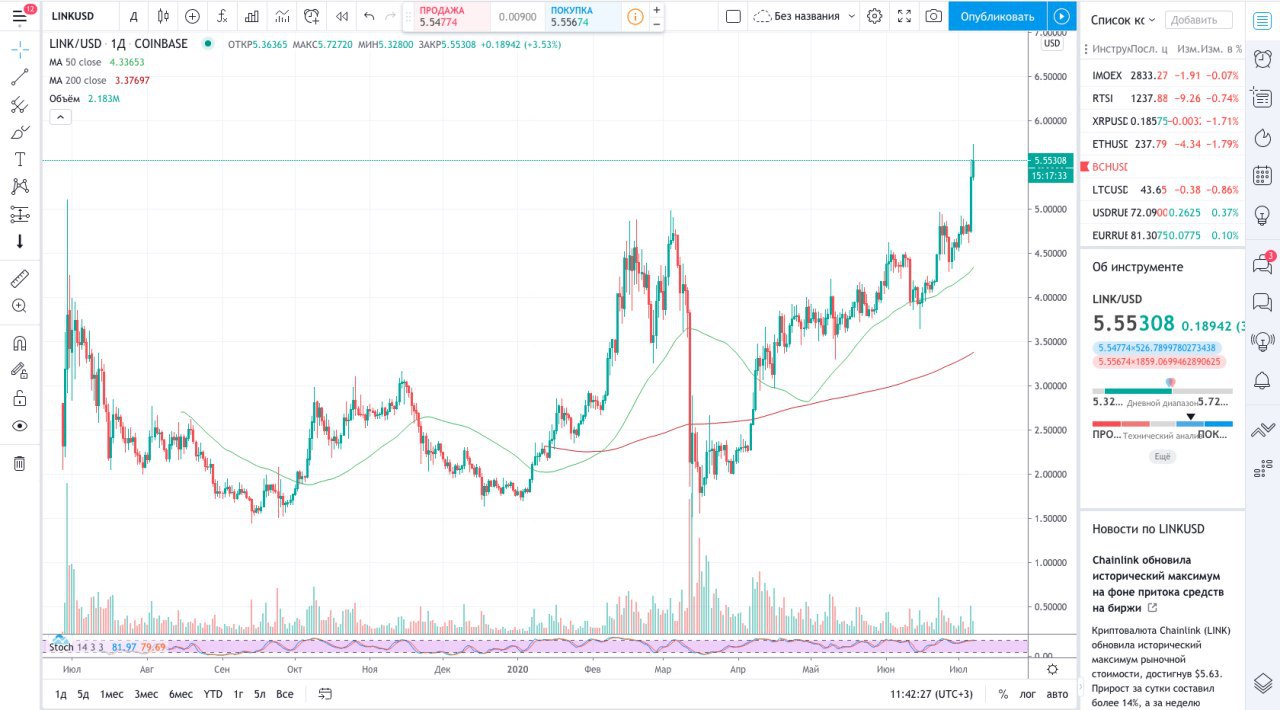 Криптовалюта Chainlink (LINK) обновила исторический максимум рыночной стоимости, достигнув $5.72. Прирост за сутки составил более 15%, а за неделю превысил 23%. Торговые объемы достигли $684 млн, взлетев более чем в два раза за сутки. Рыночная капитализация превысила $2.13 млрд, согласно CoinGecko. По этому показателю монета вышла на 12 место в рейтинге криптовалют. За несколько дней до этого аналитическая компания Glassnode зафиксировала крупнейший приток криптовалюты на биржи. 4 июля объем выведенных монет примерно с 4900 кошельков достиг 4 млн LINK (~$22.24 млн). Аналитическая фирма Santiment установила, что наибольший отток зафиксирован с кошельков, на которых хранилось 100-1000 LINK. Число таких адресов стремительно опустилось до 10% от общего количества кошельков. Если это произойдет, разработанная IntoTheBlock метрика IOMAP определяет наиболее надежный уровень поддержки в районе $4.8. Согласно инструменту, порядка 775 кошельков приобрели более 2.7 млн LINK (~$15 млн) в этом диапазоне. Следующий уровень поддержки на отметке $4.7 отличается тем, что в этом ценовом диапазоне аналогичный объем приобрели уже 1860 адресов.