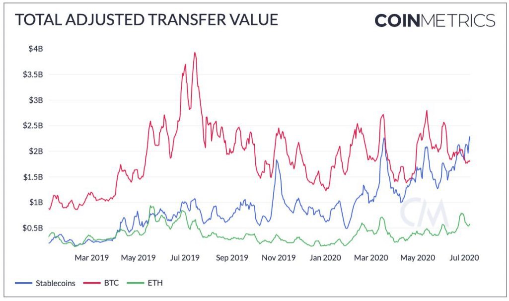 Объём транзакций стейблкоинов в июне впервые превысил показатель биткоина.