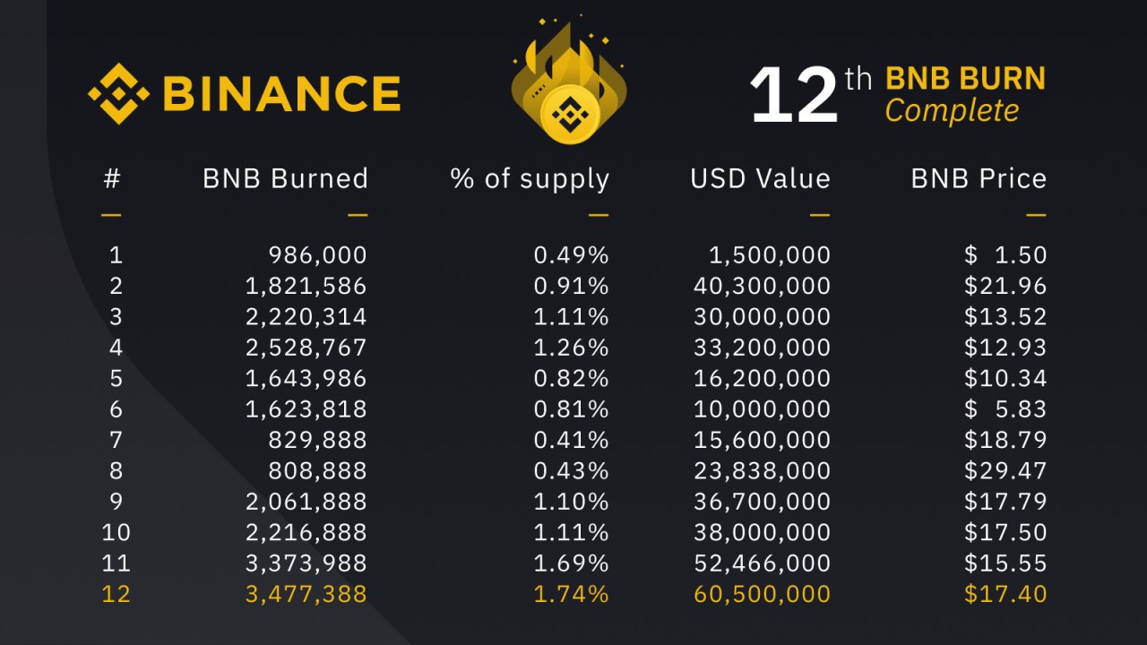 Биржа Binance в субботу отчиталась о завершении двенадцатого ежеквартального сжигания своих токенов. В очередной раз был установлен рекорд как по объему сожженных токенов, так и по их долларовой стоимости. Всего было сожжено 3 477 388 BNB ($60,5 млн) или 1,74% эмиссии. В общей сложности за 12 раз Binance сожгла 23,6 млн BNB или 11,8% эмиссии на сумму около $359 млн. Согласно плану биржи, сжигания будут проводиться ежеквартально, пока не будут уничтожены 100 млн BNB или 50% от общего объема выпущенных токенов.