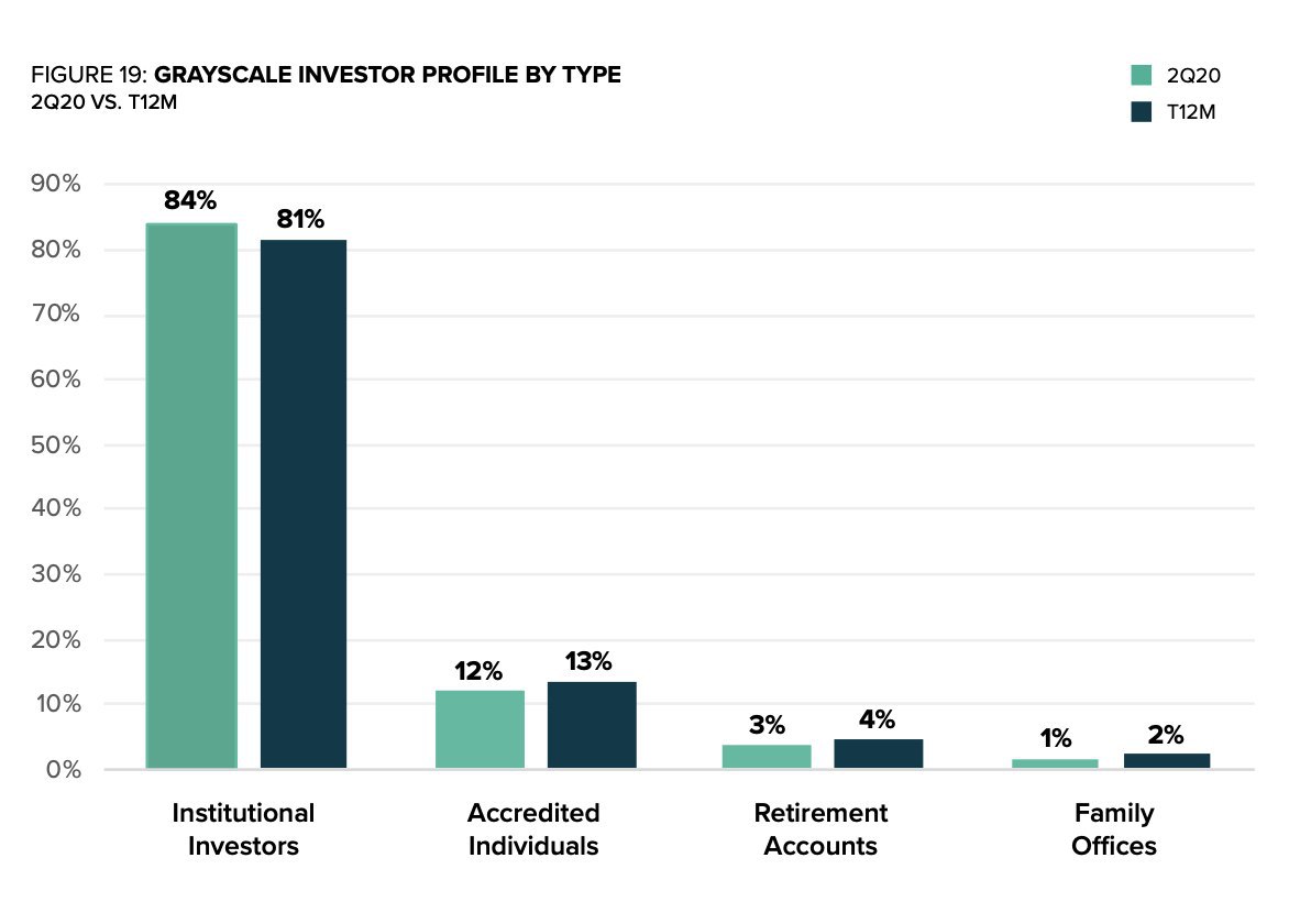 Компания по управлению цифровыми активами Grayscale Investments сегодня представила новый квартальный отчёт. Второй квартал 2020 года стал рекордным по притоку активов в продукты Grayscale. Всего за отчётный период компания привлекла $905,8 млн, что почти в два раза превышает показатели предыдущего, также рекордного на тот момент, квартала, когда инвесторы вложили $503,7 млн. По итогам первого полугодия объём инвестиций в линейку трастов Grayscale превысил $1,4 млрд. «Совокупная сумма инвестиций во всё семейство продуктов Grayscale с момента основания компании достигла $2,6 млрд. Grayscale Bitcoin Trust и Grayscale Ethereum Trust зафиксировали рекордные квартальные вливания в $751,1 млн и $135,2 млн соответственно», – говорится в документе. На долю новых участников пришлось 14% инвестиций. Они же составили 57% инвесторской базы. 84% вложений было осуществлено институциональными инвесторами, в первую очередь хедж-фондами.