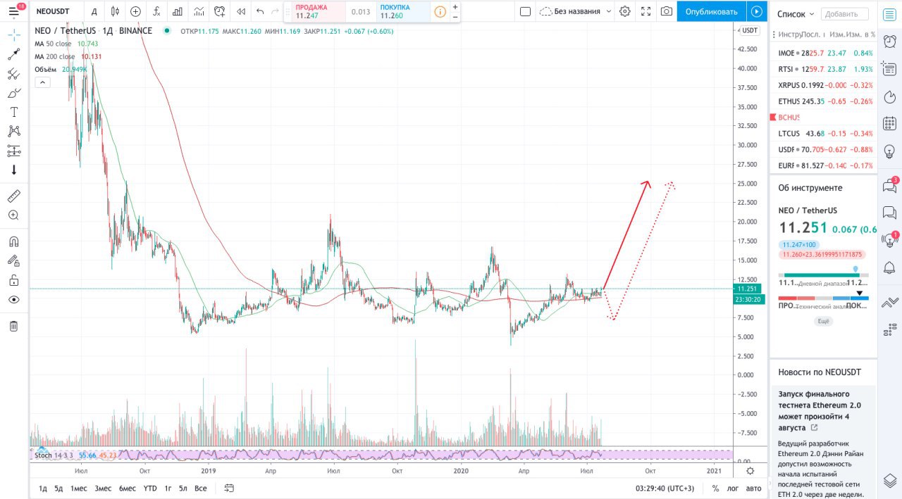 Друзья, как и обещал в прошлом ролике публикую список альткоинов, которые ещё не выстрелили, но обязательно сделают это до или же после возможного падения BTC. При этом рост ожидается до нескольких иксов от сегодняшних отметок у: Dash, ETC, LTC, EOS и NEO. Сразу предупреждаю, если не готовы переждать возможного падения BTC, не заходите сейчас ни в одну из монет. Лично я хеджирую риски шортом по биткоину поэтому и готов ждать последующего отскока. Потенциально возможное движение изображено ниже на примере графика NEO.