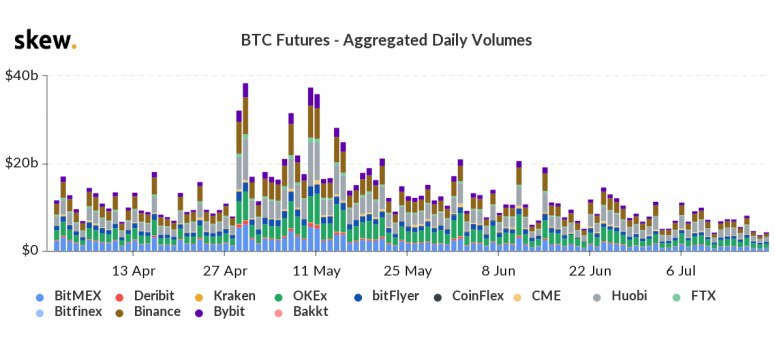 Объемы торгов биткоин-фьючерсами на Чикагской товарной бирже (CME) в пятницу составили $87 млн. В последний раз на сравнимых уровнях это значение находилось 17 апреля. Вместе с этим участники рынка стали постепенно терять интерес к торговле биткоин-фьючерсами. Это же справедливо и для других торговых платформах, включая BitMEX, Deribit, Kraken, OKEx, bitFlyer, CoinFlex, Huobi, FTX, Bitfinex, Binance, Bybit и Bakkt. Вместе с CME объем торгов на них в пятницу составил $4,65 млрд, опустившись на 87% относительно максимума 11 мая в $36 млрд. Вместе с этим, объемы торгов LINK на Coinbase выросли на 67%, XLM – на 40% до нового рекордного максимума. А объемы торгов биткоином падают третий месяц подряд. Также снизился открытый интерес или объем активных позиций на CME, который используют для оценки вовлеченности институциональных инвесторов в рынок. В пятницу значение составляло $364 млн, упав на 31% с 19 мая. Тем не менее, открытый интерес по всем биржам недавно поднялся до $4 млрд впервые после мартовского обвала. Аналитики считают комбинацию падающих объемов торгов с растущим открытым интересом признаком удержания позиций трейдерами.