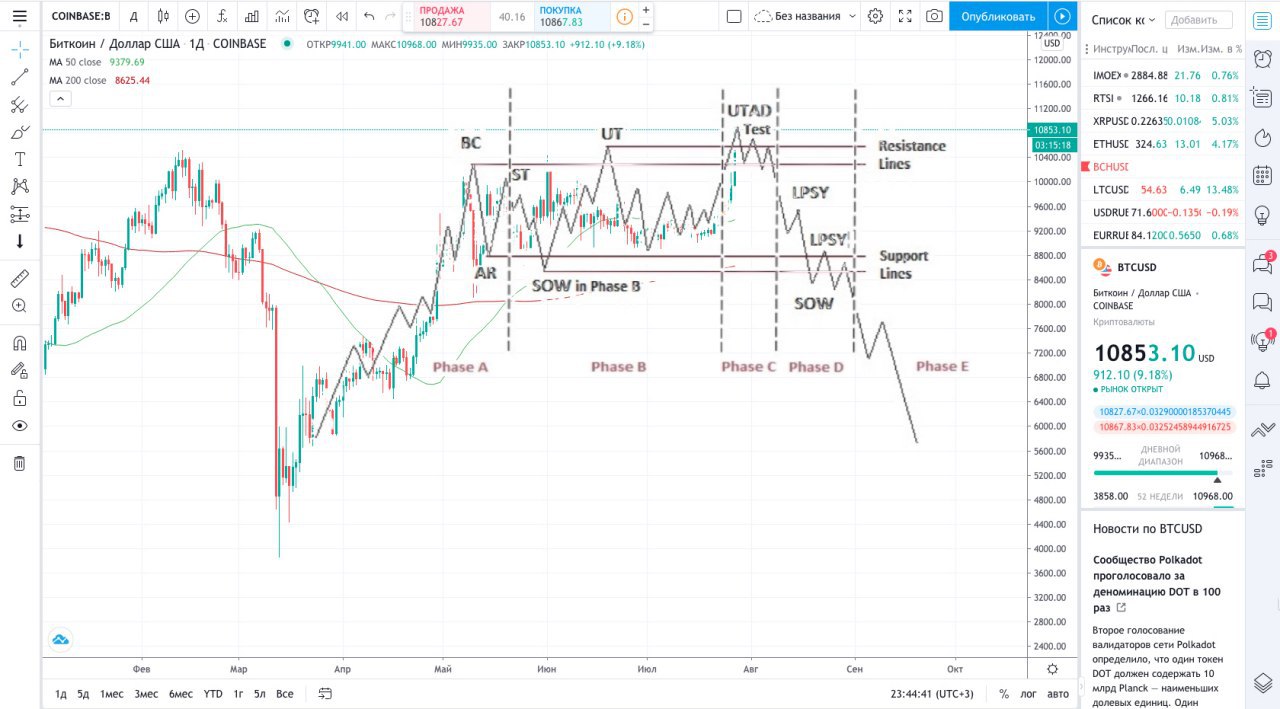 Сегодня биткоин вновь порадовал крипто энтузиастов резким ростом прибавив за сутки в цене 9%. При этом его стоимость дошла до отметки 10950$, которая является последним рубежом на схеме Вайкоффа. В прошлой публикации говорилось, что в случае пробития биткоином отметки 11000$, данная схема будет неактуальна. Но пока теханализ не подвел. Цена уперлась в этот уровень и откатилась в зону 10800-10900$ как было показано на фото (Resistance Lines). Теперь BTC перешел в Phase C (UTAD Test) и будет пытаться пробивать сопротивление. Из интересного: эту торговую неделю первая криптовалюта начала с открытия Гэпа на бирже СМЕ. Торги в прошлую пятницу закончились на отметке 9615$, а в понедельник открылись на 9925$. Тоесть Гэп придется закрывать (еще один сигнал в пользу падения)! Вот только когда? Это может случится и в ближайшее время, в рамках схемы Вайкоффа, а может и после еще одного внезапного взлета BTC и сломаного паттерна. К сожалению данную ситуацию определить невозможно, но точно известно то, что цена 100% сходит к 9615$. Также, насторожило то, что алькоины которые выстрелили ранее, при росте биткоина не пошли за ним, а упали на 10-15% (Vechain, Chainlink, ADA, Tezos, Cosmos и тд.), при этом доминация первой криптовалюты в данный момент резко подскочила! Скорей, это говорит о том, что средства из этих альтов перелили в биткоин, так как было видно, что последние уровни сопротивления ему давались с большим трудом. Мои действия: вчера очень удачно начал фиксировать альткоины, особенно те, которые сегодня просели, последними буду закрывать монеты, что еще не особо стреляли (типу LTC, ETC, EOS). Ethereum вообще очень красиво смотрится в шорт, но мне пока хватает шорта по BTC. Его буду держать до последнего, даже если схема Вайкоффа не оправдает себя, так как ликвидация у меня на 16000$ и туда уж точно не долетим, а к 9615$ мы таки сходим, где и выгоднее будет закрыть короткую позицию, которая открыта с 9200$ (так меньше потери, нежели закрывать позицию сейчас). Ну а в лучшем случае, если все пойдет согласно теханализу, закрою и шорт с прибылью на дне.