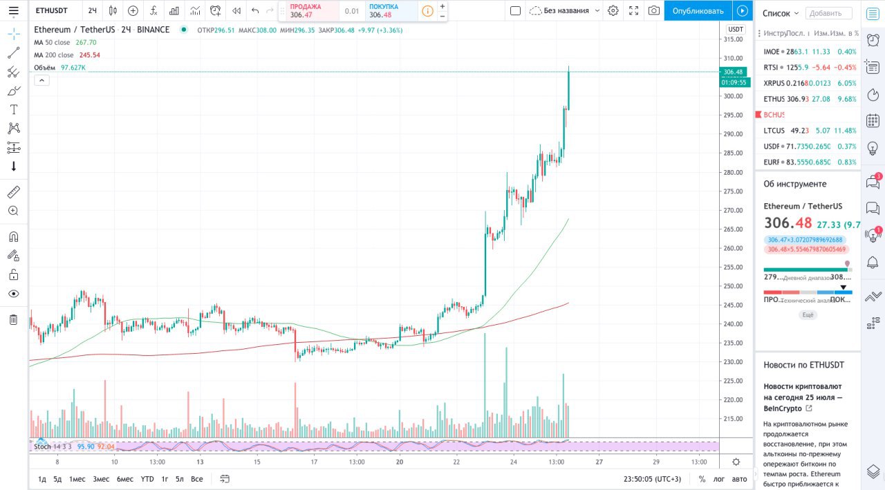 Сегодня Ethereum достиг планируемой отметки в 300$, о которой говорилось в прошлой публикации. С момента выхода обзора он безоткатно рос - https://www.youtube.com/watch?v=4NZM3KBjdiM и принес прибыль в 30%. BNB также продолжает идти вверх и с момента выхода его ролика - https://www.youtube.com/watch?v=XHueUkvL_yM полученная прибыль составила 26%. Ну и третья по профитности монета из нашей рубрики Litecoin - https://www.youtube.com/watch?v=RGjJCxcZe6Q сегодня начал свое движение и за сутки вырос на 10%. Особое внимание хочу обратить на то, что вечного роста не бывает и скоро всё очень сильно просядет, поэтому обязательно фиксируйте прибыль!!! Обзоры по оставшимся двум монетам выйдут на следующей неделе.