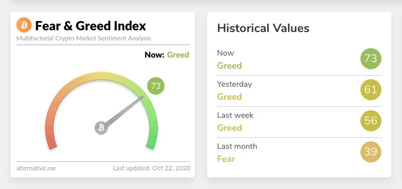 Индекс страха и жадности биткоина достиг отметки в 73 пунтка! Это конечная диапазона "Жадность", что говорит о растущем Фомо у инвесторов. Вполне вероятно в течении 1-2 дней индикатор зайдет в зону "Чрезвычайной жадности", где как правило начинаются фиксации.