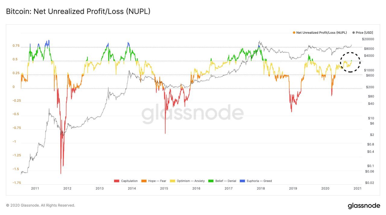 Цена биткоина превысила уровень $13 400 в этот вторник, увеличившись за сутки на 3% и установив новый 16-месячный максимум. Вместе с этим число депозитов, осуществляемых на кошельки бирж криптовалют, в понедельник упало до 9-месячного минимума в 26 889, а остатки биткоинов в таких кошельках – до двухлетнего минимума в 2 478 799 BTC. Одновременно мировые фондовые рынки устремились вниз. В частности, ведущий индекс Уолл-стрит S&P 500 упал почти на 2%. По мнению аналитиков CoinDesk, стечение этих факторов говорит о том, что инвесторы не обеспокоены из-за возможного возобновления корреляции биткоина с фондовым рынком. Участники опционного рынка также сохраняют бычьи ожидания. Соотношение цен опционов пут и колл остается в негативной зоне, свидетельствуя о том, что последние пользуются большим спросом. «Остается буквально два сопротивления на графике биткоина: $14 000 и затем предыдущий исторический максимум в $20 000. Я полностью ожидаю нового максимума, самое позднее в начале следующего года», – пишет CEO Real Vision Рауль Пал. Аналитики из компании Glassnode, тем временем, отмечают, что соотношение нереализованных прибылей и убытков впервые за более чем год оказалось в «зоне веры». «В настоящее время свыше 50% рыночной капитализации биткоина представлено нереализованными прибылями. Подобных уровней мы не наблюдали с августа 2019 года», – сообщают они. Аналитики Santiment, тем временем, утверждают, что метрики на уровне блокчейна и наблюдения за настроениями сообщества в социальных сетях сейчас дают больше поводов для беспокойства и могут говорить о перегретости рынка.