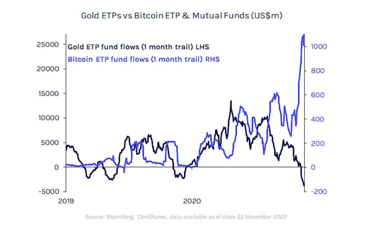 Институциональные инвесторы внесли $429 млн в криптовалютные фонды и продукты в течение недели, оканчивающейся 7 декабря. Это стало вторым крупнейшим значением в истории и подтолкнуло активы под управлением сектора к рекордным $15 млрд. В конце 2019 года показатель был равен $2,57 млрд. Такие данные приводит Reuters со ссылкой на управляющего цифровыми активами CoinShares. Крупнейший поставщик криптовалютных фондов Grayscale привлек в течение последней недели $336,3 млн, вместе с чем объем активов под его управлением вырос до $12,4 млрд. В общей сложности с начала года трасты Grayscale получили $4,3 млрд. В своем Twitter CoinShares обращает внимание на то, что до середины августа притоки активов в биткоин коррелировали с показателями золота, однако ситуация резко изменилась в течение последнего месяца.
