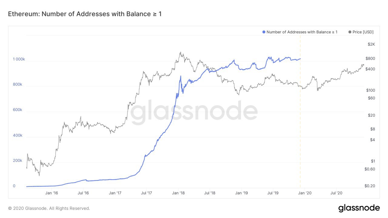 Согласно данным аналитической компании Glassnode, количество адресов Эфириума, содержащих 1 ETH и более, достигло нового рекорда и сейчас составляет 1 175 681. Это может быть связано со значительным ростом цены ETH, бумом индустрии DeFi и увеличением популярности индустрии в целом. Количество кошельков, на которых хранится минимум 1 ETH, росло в течение всего 2020 года. В январе этот показатель составлял 972 924 адреса, а в июне он перевалил за 1 млн на фоне бума индустрии децентрализованных финансов. За последние шесть месяцев количество таких кошельков увеличилось более чем на 12%. Напомню, согласно полученному ранее инсайду мы ожидаем Ethereum по 2000$ уже через пол года.
