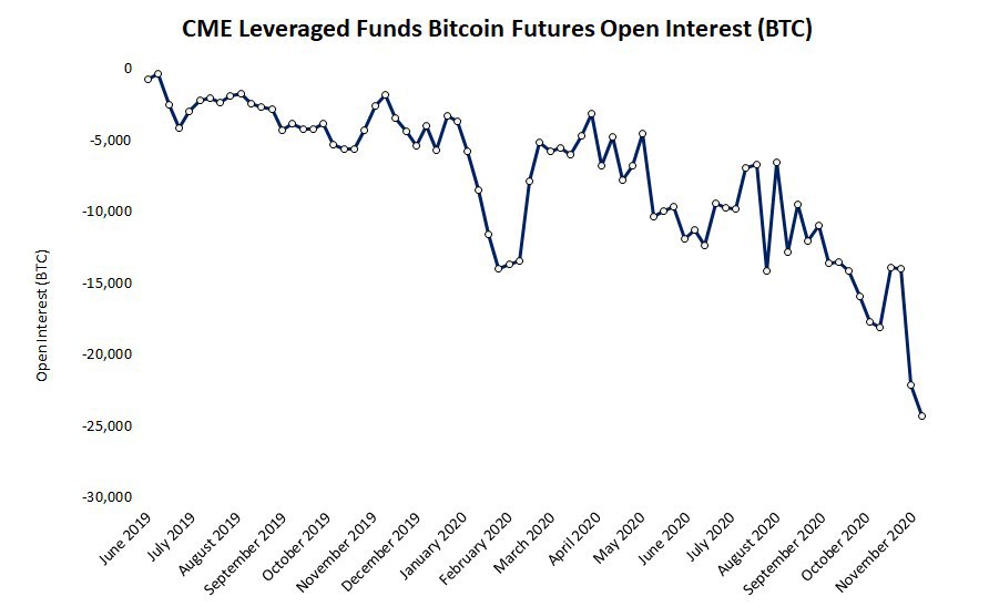 Совокупная короткая позиция использующих заемные средства участников торговли биткоин-фьючерсами на CME достигла рекордных показателей. По оценкам CoinDesk. в конце ноября он достиг 25 тысяч BTC (~$482,5 млн). Тенденция к формированию коротких позиций прослеживается с сентября. С тех пор биткоин подорожал на 60%. Трейдер Techemy Capital Джош Ольшевич усмотрел в этом стремление участников рынка захеджировать длинные позиции на других торговых платформах. Перевес в сторону коротких позиций усилился у хедж-фондов и прочих крупных игроков - 58%, по состоянию на 1 декабря. Трейдеры, попадающие в категорию Nonreportable и формирующие 17% от совокупного ОИ, напротив, нарастили длинные позиции до исторических максимумов. 87% открытого интереса мелких трейдеров приходится на лонг. По итогам ноября на CME объем ОИ составил $951,58 млн, а объем торгов - $18,04 млрд.