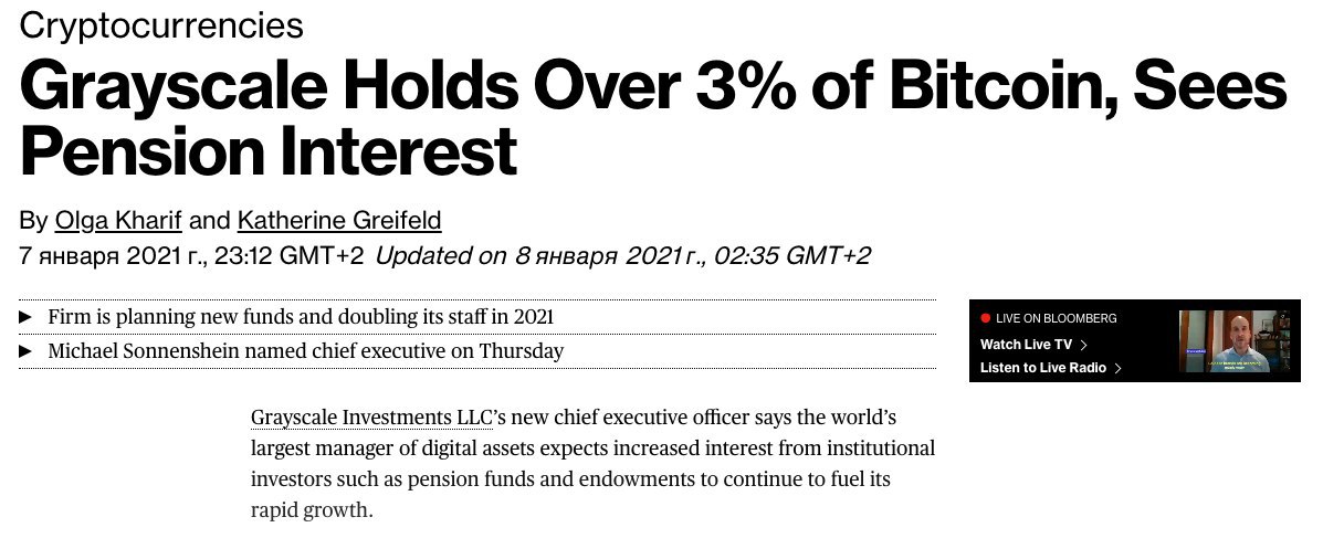 Все больше институциональных инвесторов начинает присматриваться к биткоину, сообщил новый генеральный директор компании Grayscale Investments Майкл Зонненшайн. «Мы начинаем видеть участие не только сегмента хедж-фондов, которые мы наблюдаем долгое время, но и с недавних пор других учреждений, пенсионных и университетских фондов, – сказал он в разговоре с Bloomberg. – Размеры их аллокаций тоже стремительно растут». Согласно последней отчетности, объем активов под управлением Grayscale вырос до рекордных $27,4 млрд против $2 млрд год назад. Фирма распоряжается десятью фондами и владеет более чем 3% всех выпущенных к сегодняшнему дню биткоинов. Биткоин-траст привлек наибольший объем активов на фоне подъема цены криптовалюты выше $40 000. Согласно Зонненшайну, Grayscale намерена увеличить свой текущий штат из 24 человек в два раза, продолжить инвестировать в рекламу и запустить около полудюжины новых продуктов в этом году. Он также признал, что действия Grayscale могут оказывать влияние на объем доступных биткоинов на рынке.