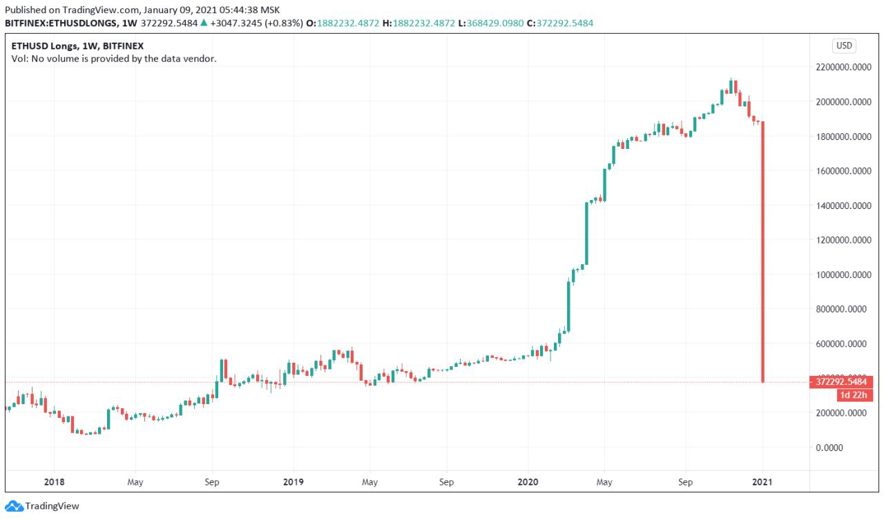 На бирже криптовалют Bitfinex в пятницу произошло первое за все время крупное закрытие длинных позиций на Ethereum. Как видно на графике, с августа 2017 года показатель рос большую часть времени, а особенно стремительным подъем стал в начале 2020 года. В течение года открытый интерес вырос от 500 000 ETH до 2,13 млн ETH. За последние сутки объем таких позиций сократился на 1,5 млн ETH ($1,8 млрд). Снижение от пика составляет 84%. «Что происходит на Bitfinex с длинным открытым интересом на Ethereum? – задаются вопросом аналитики. – Неужели наш кит-альфач закрывает свою огромную позицию с прошлого года? Глюк данных? Поведение рынка не поддерживает эти данные». Не исключено, что позиции были востребованы их держателем, то есть он получил выплату в ETH и таким образом избежал необходимости проводить расчет на рынке, что резко негативно отразилось бы на цене криптовалюты. Нечто подобное произошло с короткими позициями на биткоин в 2019 году.