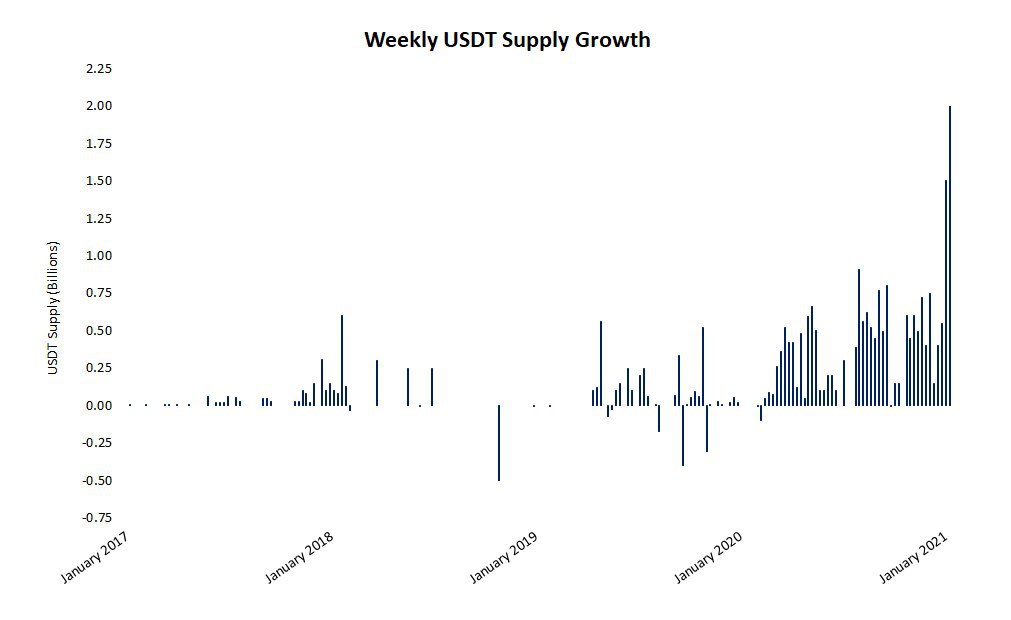 Tether выпустил рекордные 2 млрд USDT за одну неделю.