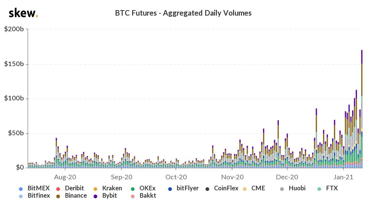 Платежный сервис PayPal обработал $242 млн в связанных с криптовалютными операциями заявках за один день 11 января, обращает внимание CEO NuggetsNews Алекс Сондерс. «Пришли розничные инвесторы. PayPal обработал $242 млн в продажах криптовалют вчера. Это примерно в два раза превышает предыдущий рекорд», – пишет он. 11 января собственный максимум был зафиксирован и на бирже Coinbase – там объемы составили $9,56 млрд, за один день превысив показатель первого квартала 2019 года. Еще один рекорд установила Чикагская товарная биржа (CME), обслуживающая институциональных инвесторов на своем рынке биткоин-фьючерсов, с приблизительно $5 млрд оборота. Совокупный объем торгов на фьючерсном рынке биткоина в целом составил $170 млрд за сутки. Объем ликвидаций - более $3 млрд.