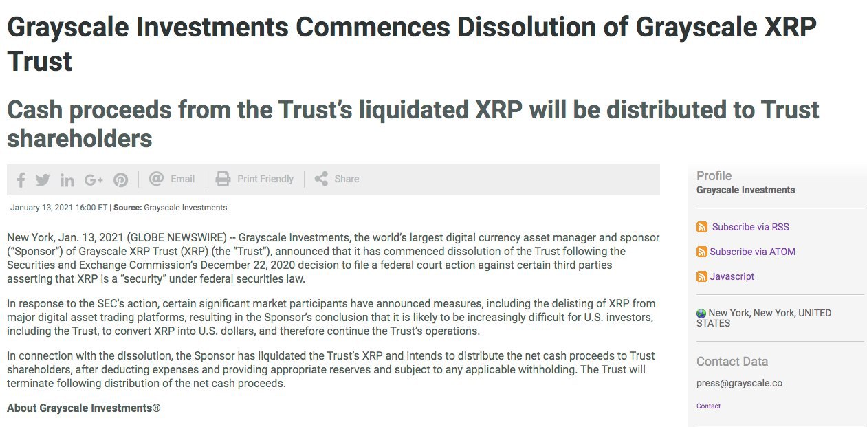 Grayscale ликвидирует инвестиционный траст на базе XRP.