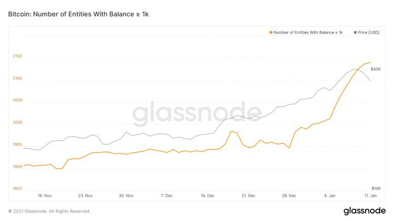 Крупные держатели биткоина наращивали позиции во время снижения рынков в понедельник, свидетельствуют данные Glassnode. Число «китовых образований», то есть кластеров адресов, принадлежащих одному частнику сети и содержащих свыше 1 000 BTC, 11 января выросло до новой рекордной отметки в 2 140. Это произошло на фоне 20-процентного падения курса первой криптовалюты к уровню $30 000. Одновременно данные компании указывают на ликвидацию позиций некоторых розничных инвесторов. Так, число адресов, содержащих меньше 0,01 BTC, незначительно снизилось в ответ на падение курса.