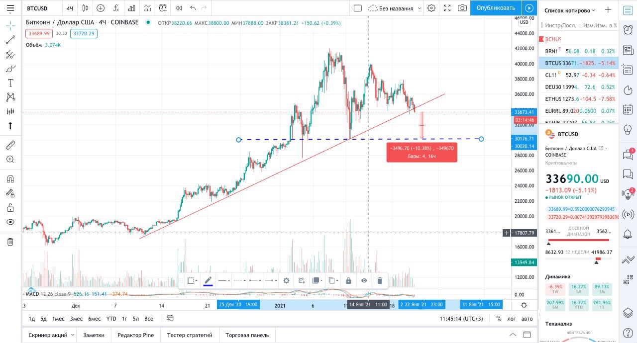 BTC стоит у важной отметки, упершись в линию тренда! Если в ближайшее время не произойдет отскок выше $35 000, тогда увидим 10-ти процентную коррекцию в зону $32 000-30 000. Учитывая сколько недавно завели на биржи битков, а после стейбкоинов, такой вариант весьма вероятен! Если открывали лонги в средне- и долгосрок, советую их продолжать держать, а вот для краткосрочных сделок лучше выставить стопы!