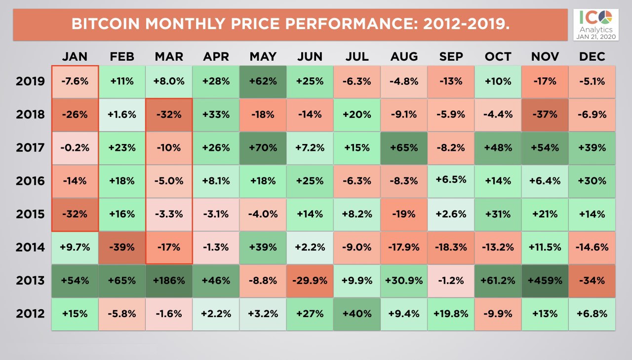 Январь знаменует начало нового налогового сезона в США. Также исторически это время, когда динамика цены биткоина замедляется по сравнению с другими месяцами года. Некоторые аналитики считают, что это не совпадение. С 2014 по 2020 год цена биткоина снижалась в январе четыре года из семи отслеживаемых, а также в марте – шесть лет из семи. По данным Delphi Digital, среднее снижение за эти месяцы составило 5.24% и 12.59% соответственно. Это ни в коем случае не представляет собой прогноз на отдельной основе, но важно это отметить.