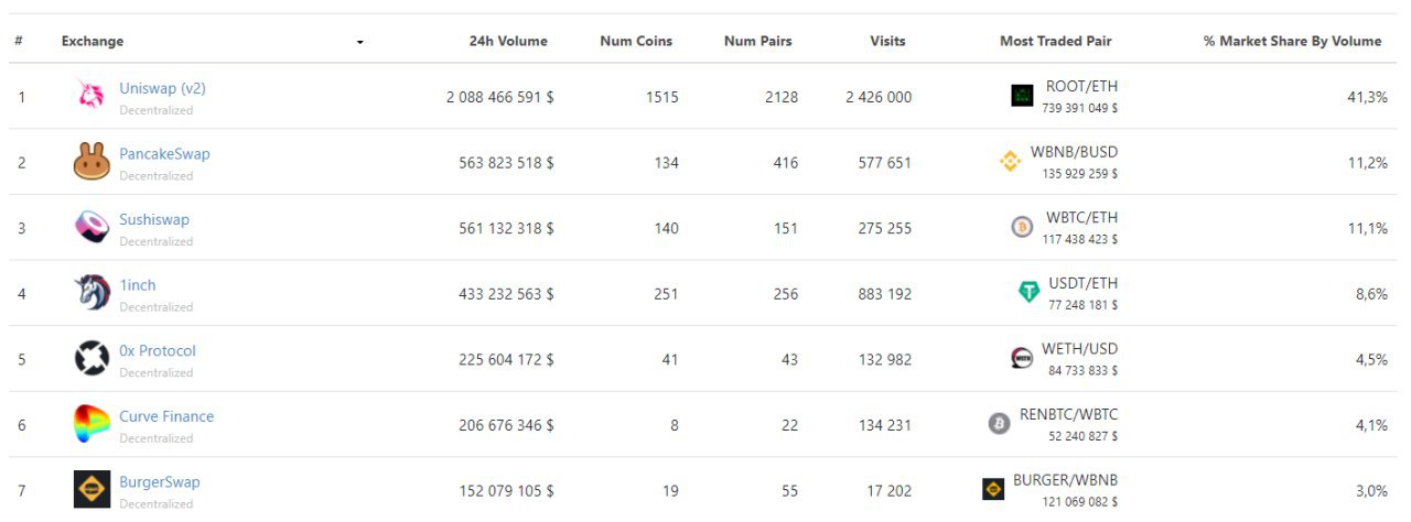 Сегодня утром курс собственного токена протокола автоматизированного маркетмейкера PancakeSwap (CAKE) в очередной раз обновил максимумы на отметке $7,22, поднявшись почти на 500% за две недели и на 1 160% за месяц. PancakeSwap запустился в сентябре 2020 года на блокчейне Binance Smart Chain (BSC). BSC позиционируется как более дешевая и быстродействующая альтернатива Ethereum. В результате PancakeSwap сегодня впервые вышел на второе место в списке крупнейших децентрализованных бирж, обойдя SushiSwap. «Сегодня важный день, – написал в Twitter CEO Binance Чанпен Чжао. – Binance Smart Chain обошла Ethereum по числу транзакций в день. Это подтверждает логику, согласно которой низкие комиссии привлекают пользователей и проекты».