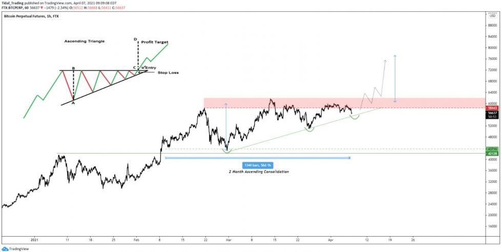 Трейдеры и аналитики на рынке биткоина сходятся во мнении, что следующая вероятная цель для первой криптовалюты находится на уровне $70 000 или выше. Прогноз основывается на классической фигуре технического анализа – восходящем треугольнике. Паттерн формируется при возникновении двух и более впадин и почти равных максимумов. С течением времени проходящие через ключевые точки линии начинают сближаться, образуя тот самый треугольник. На протяжении двух последних месяцев биткоин выполнил почти все условия для формирования этого бычьего паттерна. Уровень $60 000 несколько раз тестировался в качестве сопротивления, тогда как поднимающаяся линия снизу продолжает удерживать цену от более глубокого падения. Теперь, чтобы сценарий получил логическое продолжение, биткоину необходимо вырваться из треугольника вверх. Восходящий треугольник также позволяет спрогнозировать, насколько крупным будет следующее движение. Считается, что оно соответствует максимальной дистанции между линиями. Таким образом, прорыв фигуры предполагает подъем по крайней мере до $75 000, однако уровень $70 000, скорее всего, окажется психологически значимым сопротивлением. Напомню, в нашем youtubе канале уже давался прогноз с такой же целью, задолго до формирования данного паттерна.