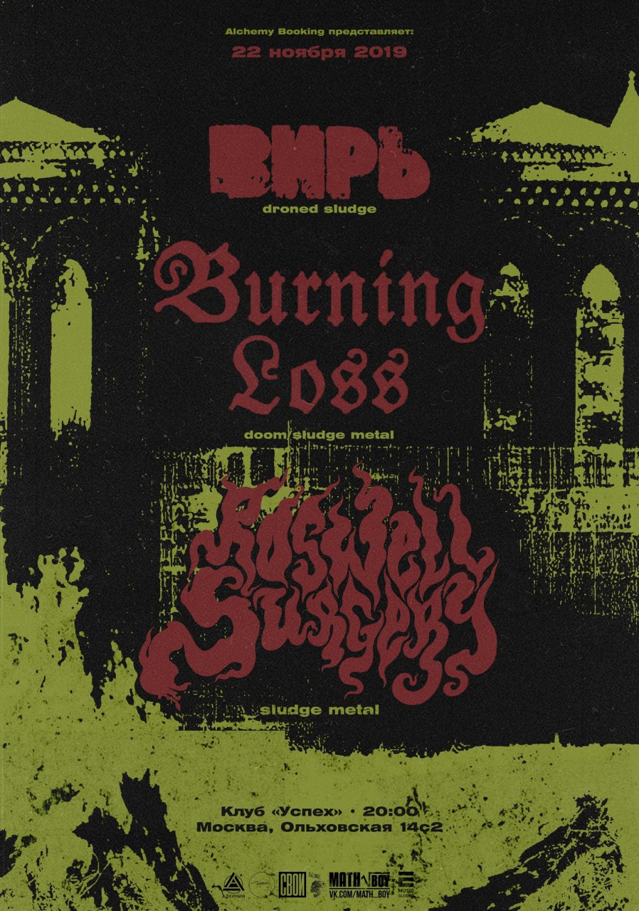 в эту пятницу, 22-го ноября у нас выступят ветераны московской сцены шумовые дроун-сладжеры «Вирь», сладж-металисты Roswell Surgery и дум/сладж-металисты Burning Loss.