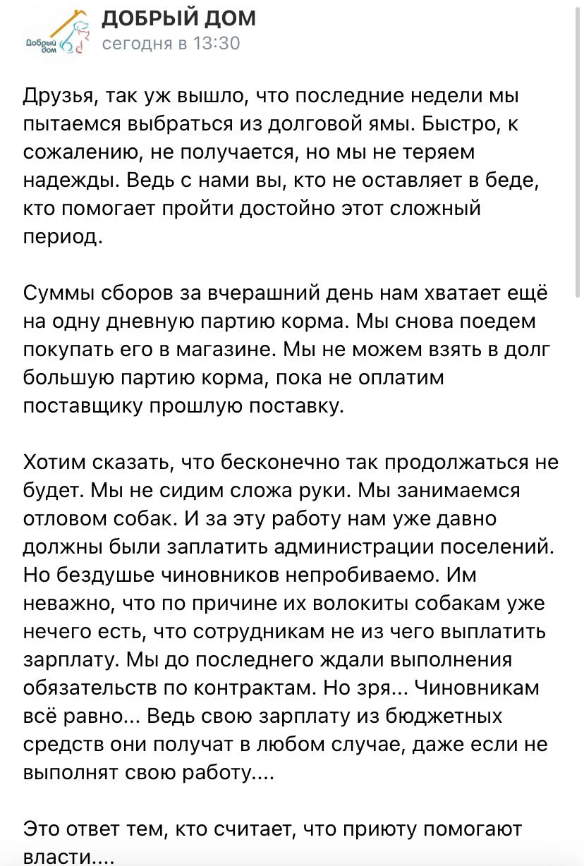 Приют выполнил несколько госконтрактов, но деньги так и не получил. Теперь «Добрый дом» собирает донаты на корм собакам, но денег всё равно не хватает. Приют полностью заполнен, новых животных, которых подкидывают под ворота, приходится оставлять бездомными.