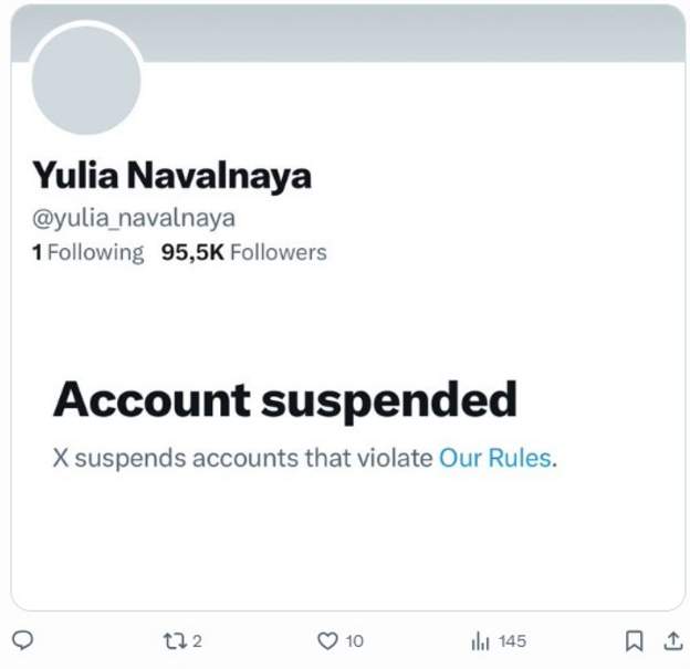 Обнаружилось, что действие открытого вчера, 19 февраля, в соцсети Х аккаунта Юлии Навальной приостановлено.