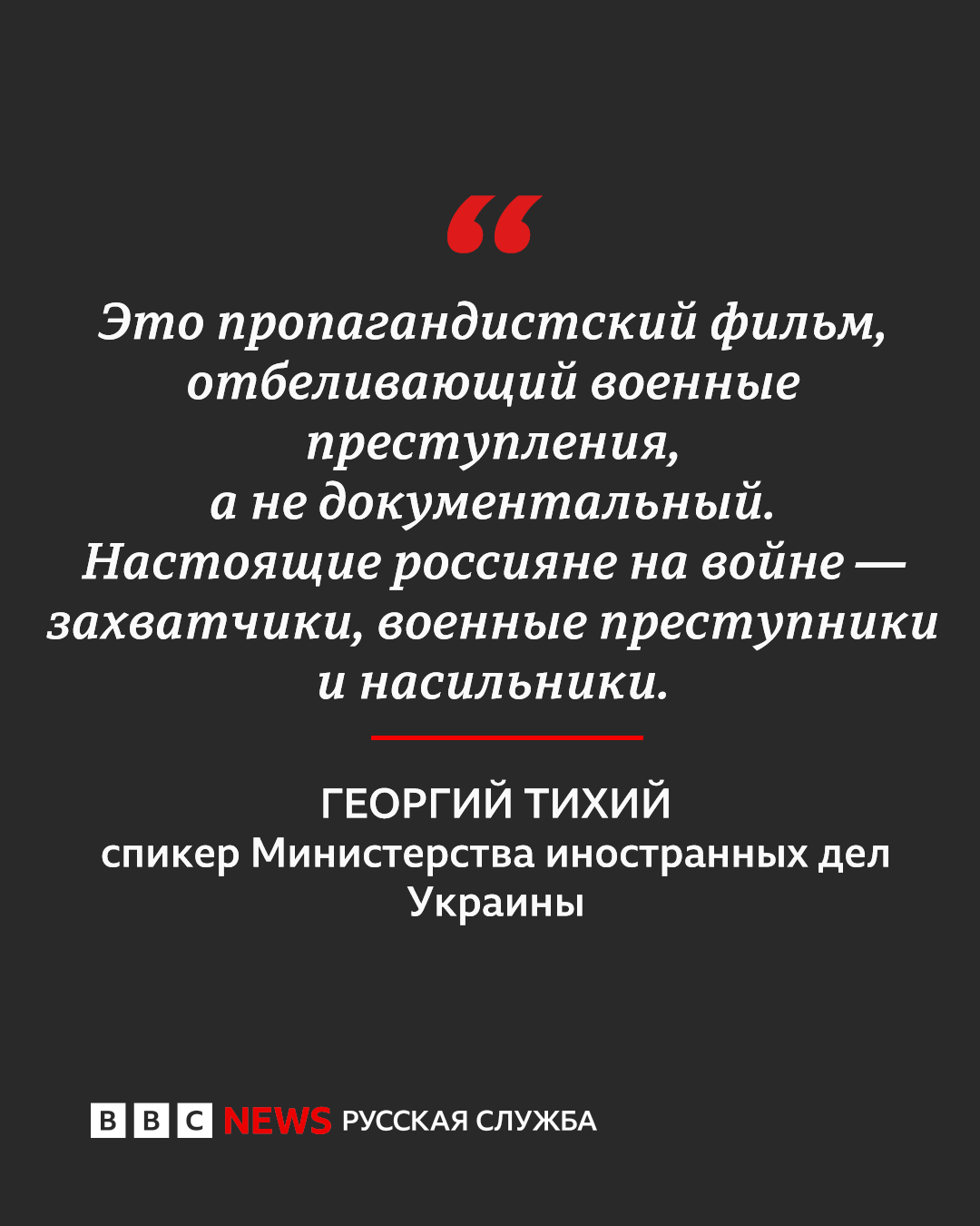 «Мы призываем организаторов Zurich Film Festival не портить репутацию фестиваля показом фильма „Russians at War“. Это пропагандистский фильм, отбеливающий военные преступления, а не документальный. Настоящие россияне на войне — захватчики, военные преступники и насильники. Покрывая их, вы становитесь соучастниками», — написал в соцсети Х спикер Министерства иностранных дел Украины Георгий Тихий.