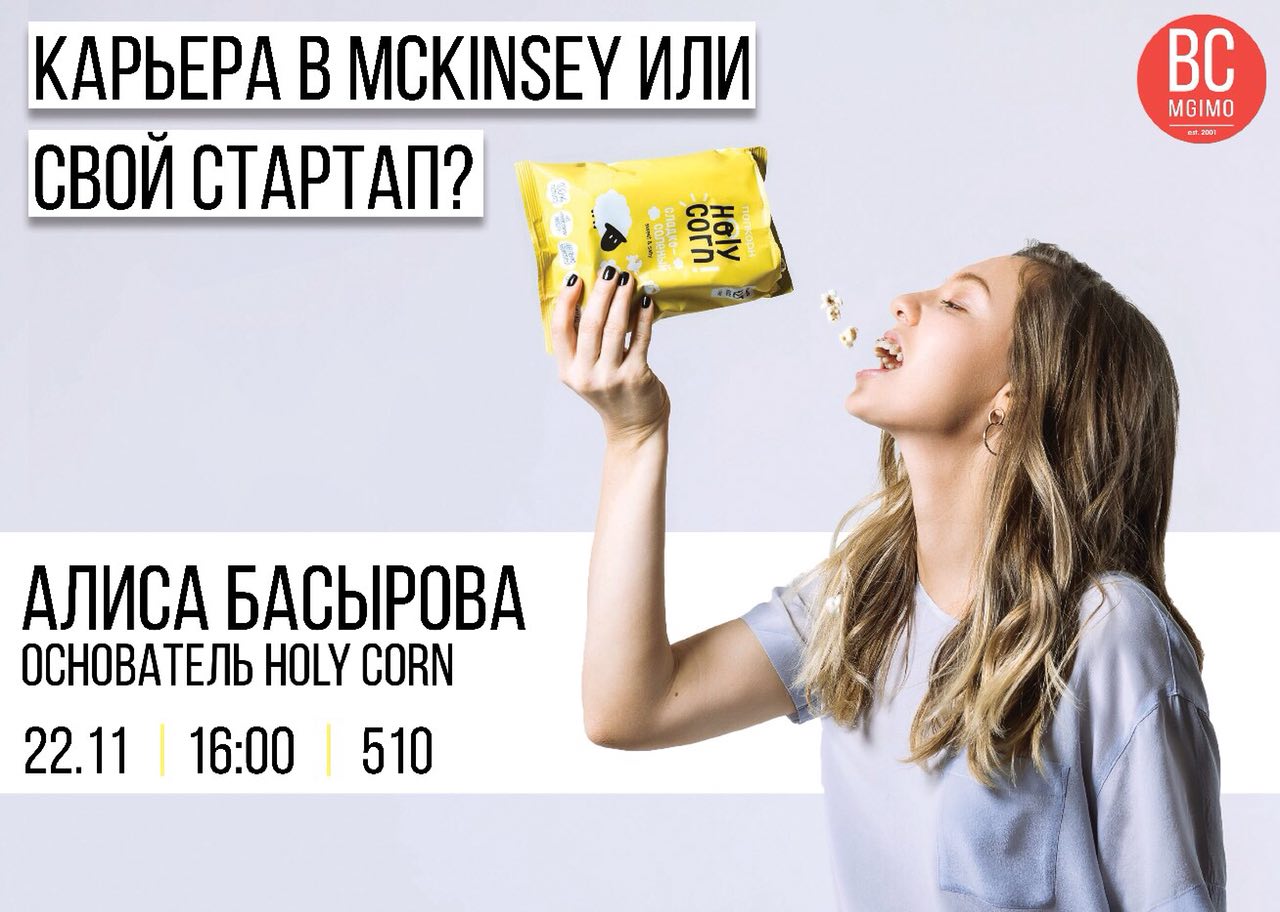 МГИМО посетит Алиса Басырова – наша особая гордость – выпускница МЭО МГИМО, основавшая собственную компанию по производству ЗОЖ-попкорна Holy Corn. Отказавшись от инвестиций, Алиса самостоятельно создала один из самых успешных и быстро развивающихся стартапов.😍