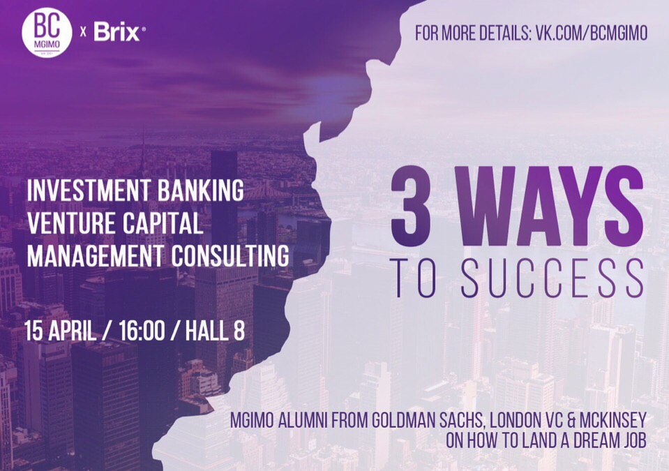 Команда Бизнес-клуба МГИМО совместно с нашими друзьями из Brix приглашают тебя на авторское мероприятие «3 ways to success». У тебя будет шанс погрузиться сразу в 3⃣ индустрии за1⃣ вечер!