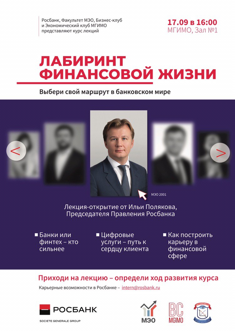 17 сентября в рамках первой лекции курса Председатель Правления Росбанка, выпускник ф-та МЭО, Илья Поляков расскажет: