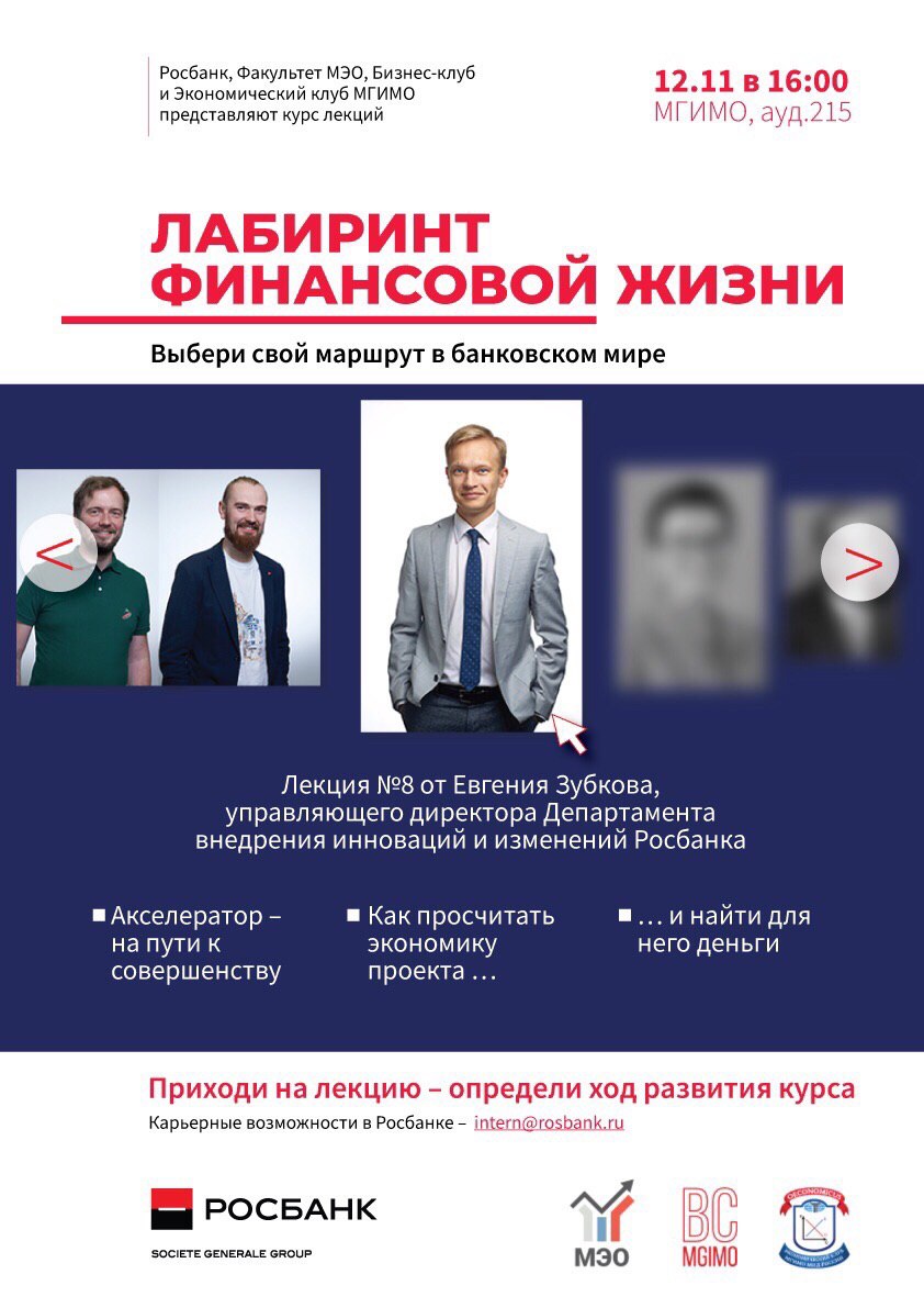 Восьмая лекция в рамках курса «Лабиринт финансовой жизни» от Евгения Зубкова, управляющего директора Департамента внедрения инноваций и изменений Росбанка