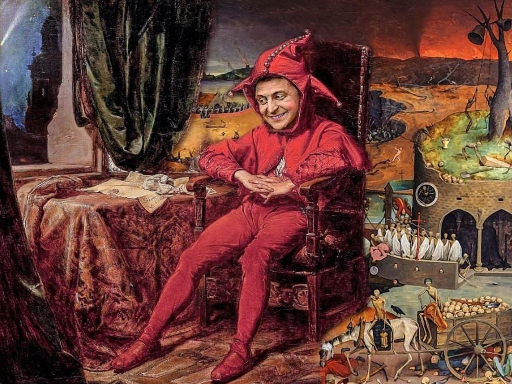 У контрацептива день рождения и сегодня у себя в бункере он будет нюхать праздничный кокоинум. Зельц, как Керенский, везде шарится в полувоенном костюме, а позавчера напялил в Давос кроссовки на ахуенной платформе. Зачем? Я думаю, что он продолжает работать комиком. Зельц пытается смешить. Я много бы дал за то, чтобы знать, как над ним прикалываются макароны, мерцы и фон дер фройляйны. Какими словами его обзывают. А они злые, они обзывают. Лишь дорогой Дональд Фредович, как герой капиталистического труда унижает клоуна тем, что он непрофессионален. В США - это самое обидное оскорбление. Сколько не искал примеры шута в короне, их нет. Был во Франции Шико, но совсем не Зельц, а благородный дворянин, погибший от руки взятого им в плен принца крови, которому благородно оставил шпагу. Тот шут, воевал, а этот трус и фронт посещает зная, что за это ему ничего не будет. Знает, что проиграл войну, но продолжает не давать людям уехать и отправлять их на убой. Морозит людей в их квартирах и хочет за это горячей любви. Тирания при нем достигла размеров невиданных. Людей хватают на улицах, в квартирах, бьют и унижают. Прессу он превратил в хор мальчиков-кастратов. Разогнал Конституционный суд, а другие суды опустил до оказания платных услуг. В позапрошлом году ко дню своего рождения он укокошил шестьдесят пленных ВСУ, которых РФ возвращала домой на самолете. Инвалиды войны без рук, без ног получают пенсию 200 долларов, которая, по логике, должна покрыть коммунальные услуги, стоимостью в три раза больше. Какая жалость, что я не смогу приехать и піздравить! Чтобы я не приехал и кто-нибудь не уехал Зельц забанил границу с РБ и закопал там миллион мин. Ну ничего - мы еще встретимся. Правда выпить не выйдет - он нюхает. Обещал, что будет президентом мира - выполнил. Вот Путина победит и будет. Обещал, что никто при нем не будет плакать - сдержал. Ни один олигарх не зарыдал. Вы видели плачущего Пороха или Каломойшу? Я нет. Жить стало лучше, жить стало веселее. Ночью спать без отопления и электричества холодно, так целыми улицами, как начнут смеяться. Чего смеются?