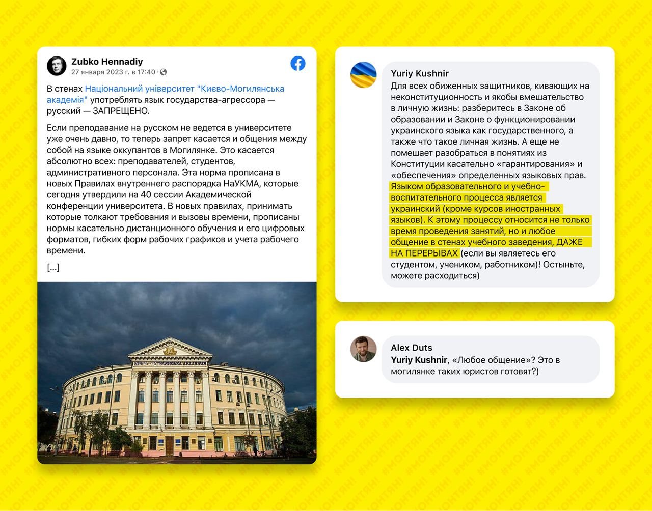 В Киево-Могилянской Академии запретили говорить по-русски, сообщает член набсовета вуза Геннадий Зубко. Стоит подчеркнуть: речь идет даже не об учебном процессе (из него русский выкинули еще до войны), а вообще о русском языке в стенах Могилянки. То есть даже общение студентов между собой в общежитии на русском или слесаря с электриком также будет являться «нарушением правил внутреннего распорядка» со всеми вытекающими.