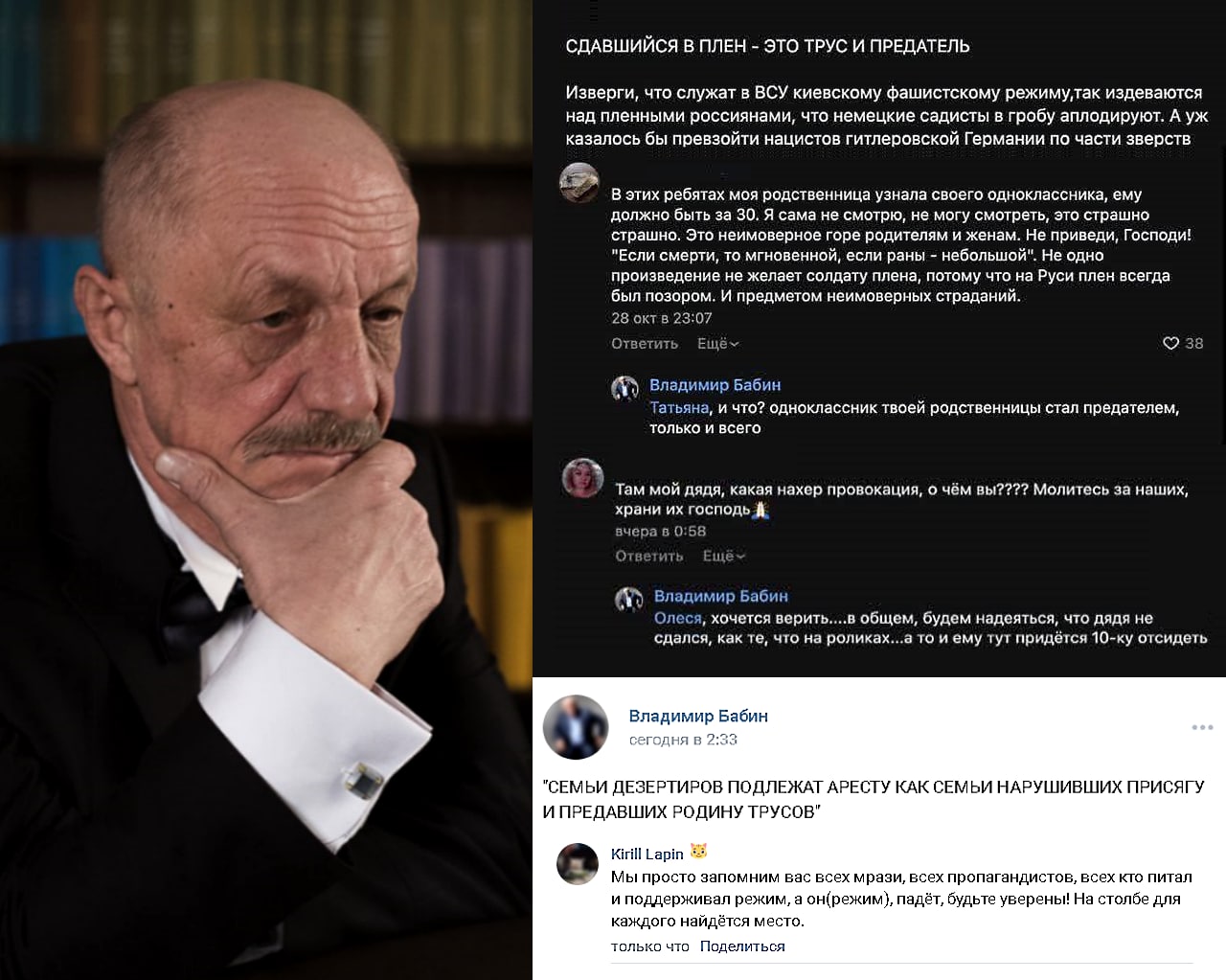 При этом он восхитился СССР, где дезертиров расстреливали, а их близких лишали помощи от государства. После этого в комментарии к Бабину пришли родственницы военных, которые пожаловались на отсутствие подготовки, плохое снаряжение и решения военного руководство. Журналист заявил, что их близкие стали предателями, а истории про плохое обеспечение — происки украинцев. Сам Бабин в армию не идет (потому что ему 70), его 40-летний сын также не на фронте.