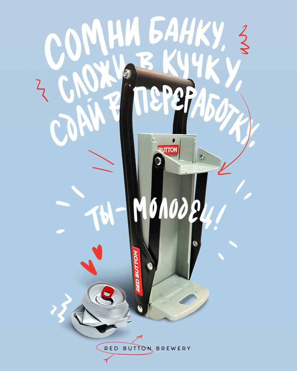 Не все сильные мира всего могут смять все банки мира, как русский Арни, но вот переработать больше алюминия хотят все. Red button любит всех и сделал мерч, чтобы вы помогали окружающей среде, попивая пивко в своём квартале.