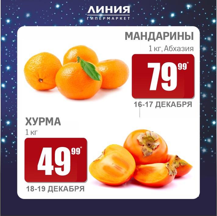С сегодняшнего по завтрашний день, 17 декабря, мандарины, 1кг — 79,99 рублей и скидка на полуфабрикаты собственного производства -30%.