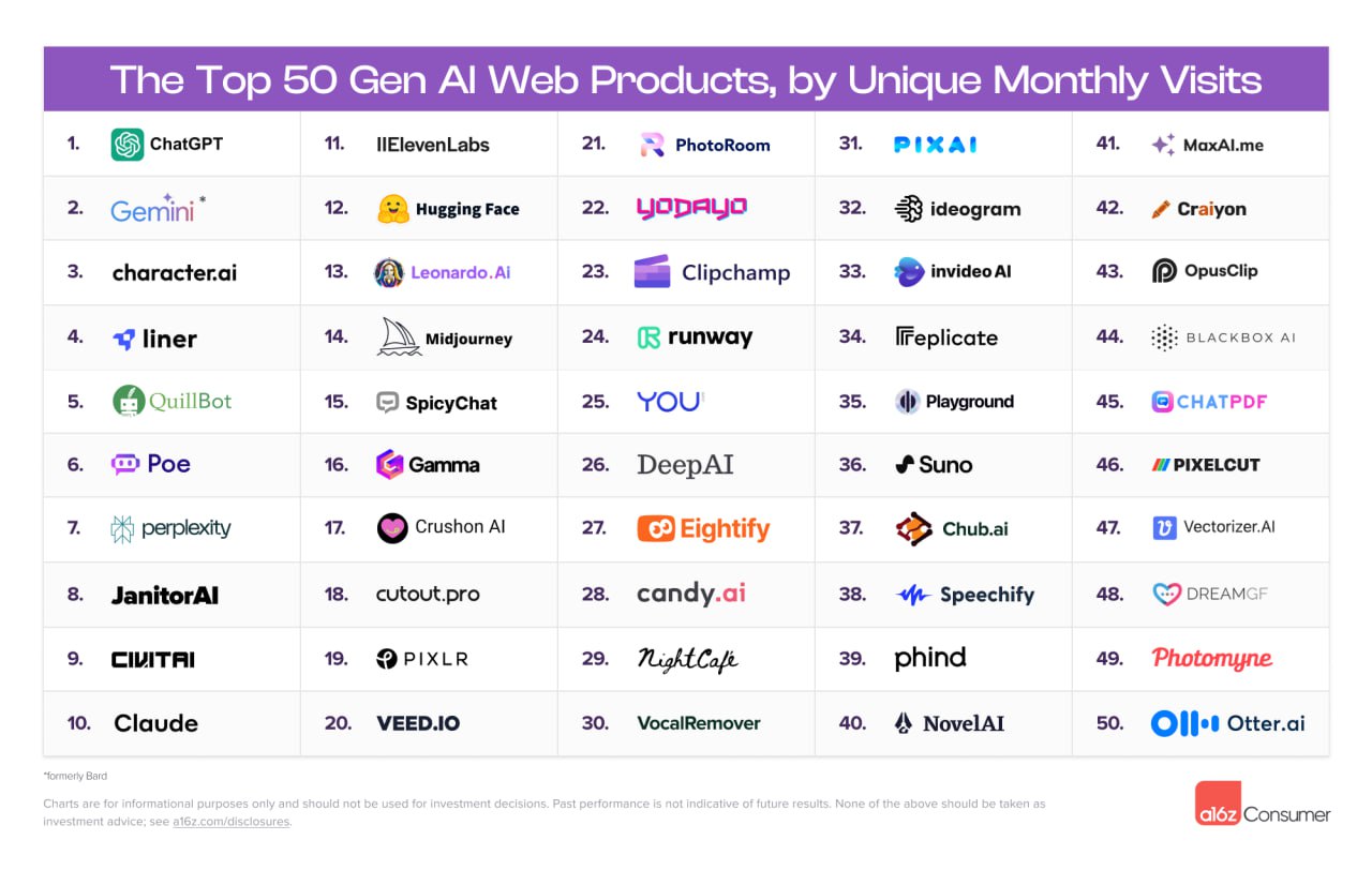 ▪️Две новые растущие категории применения: создание музыки (Suno AI) и повышение продуктивности в работе. Например, Eightify, который смотрит видео за вас и выдает ключевой контент в виде текста и Otter, который поможет сформировать заметки с видеовстреч.