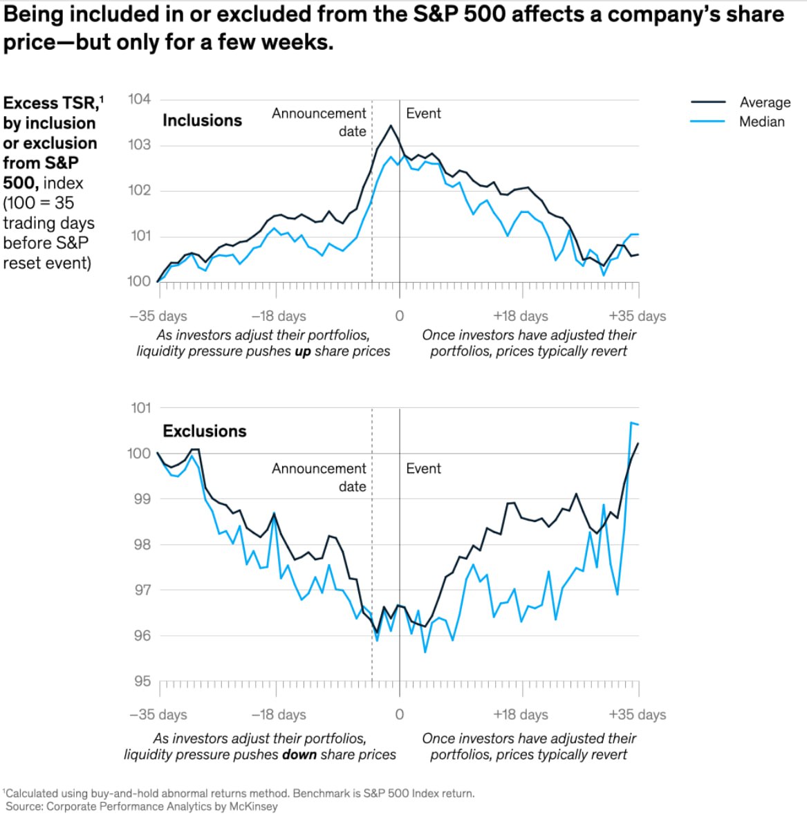McKinsey подтвердили наблюдение, что акции компаний, которые включаются в S&P 500, демонстрируют рост за месяц до включения, при этом в среднем после самого добавления в индекс наступает коррекция. Обратная ситуация наблюдается при исключении — акции растут после удаления из индекса и возвращаются к своей "фактической стоимости".