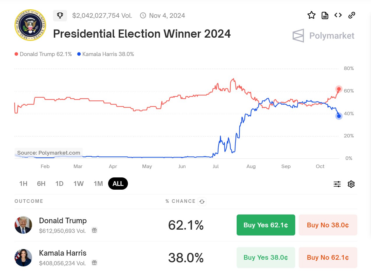 ▪️Рынок закладывает победу Трампа, это видно по росту акций банков и криптовалюты (на Polymarket, где люди делают денежные ставки, Трамп вышел в лидерство с отрывом, прикрепил сегодняшний расклад). Сам он не уверен, кто победит на выборах и заявил, что не голосовал бы ни за кого из двух кандидатов. Не воспринимает публичные опросы.